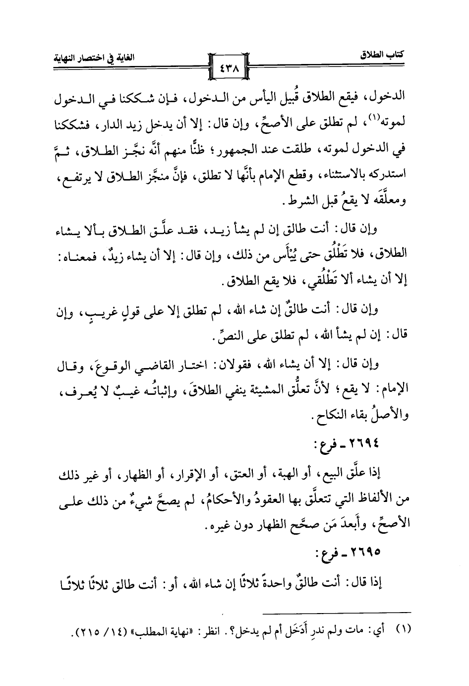 الدخول، فيقع الطلاق قُبيل اليأس من الدخول، فإن شككنا في الدخول لموته (¬1)، لم تطلق على الأصحِّ، وإِن قال: إلا أن يدخل زيد الدار، فشككنا في الدخول لموته، طلقت عند الجمهور؛ ظنًّا منهم أنَّه نجَّز الطلاق، ثمَّ استدركه بالاستثناء، وقطع الإمام بأنَّها لا تطلق، فإنَّ منجَّز الطلاق لا يرتفع، ومعلَّقَه لا يقعُ قبل الشرط.