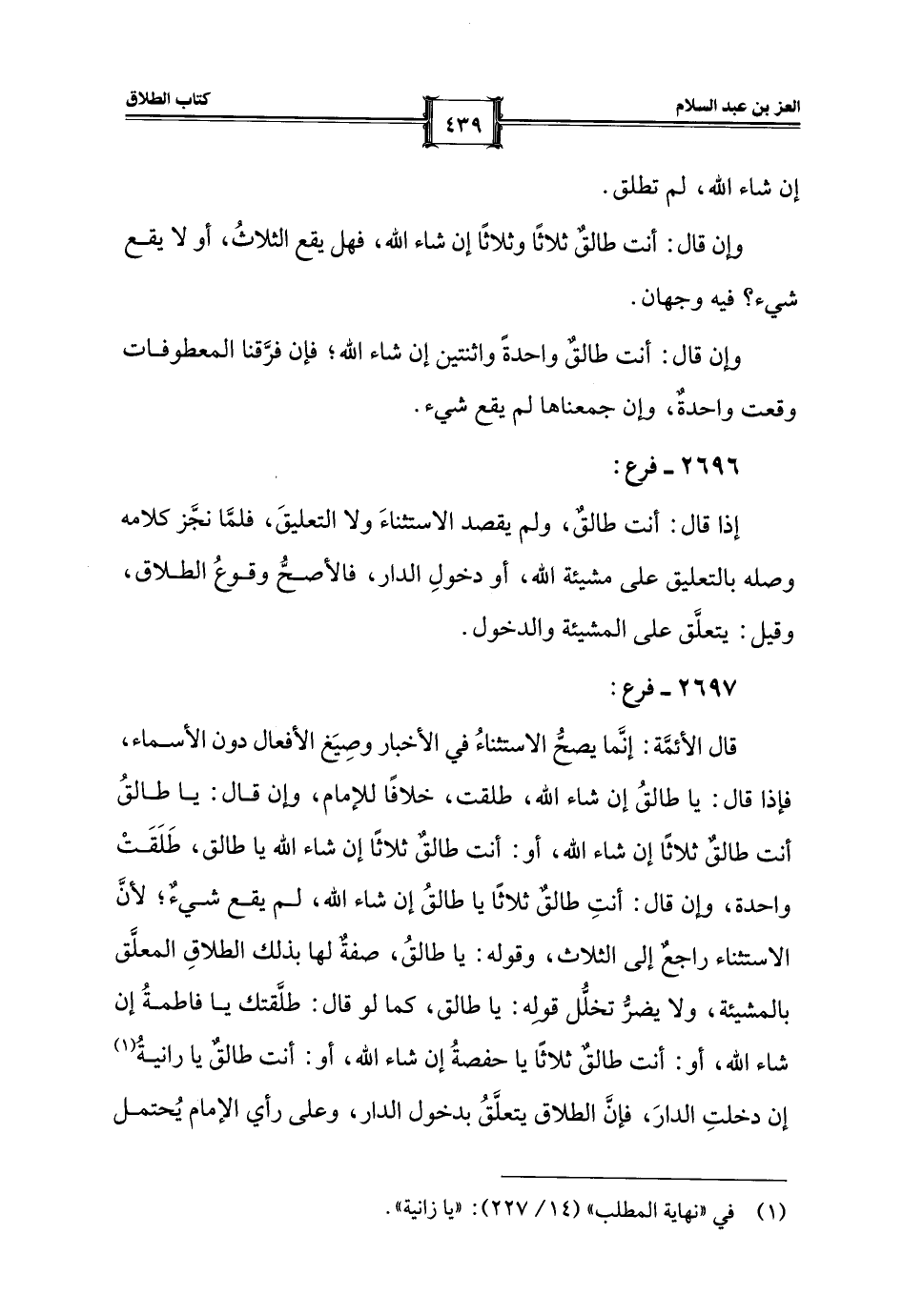 قال الأئمَّة: إنَّما يصحُّ الاستثناءُ في الأخبار وصِيَغ الأفعال دون الأسماء، فإذا قال: يا طالقُ إن شاء الله، طلقت، خلافًا للإمام، وإِن قال: يا طالقُ أنت طالقٌ ثلاثًا إن شاء الله، أو: أنت طالقٌ ثلاثًا إن شاء الله يا طالق، طَلَقَتْ واحدة، وإِن قال: أنتِ طالقٌ ثلاثًا يا طالقُ إن شاء الله، لم يقع شيءٌ؛ لأنَّ الاستثناء راجعٌ إلى الثلاث، وقوله: يا طالقُ، صفةٌ لها بذلك الطلاقِ المعلَّق بالمشيئة، ولا يضرُّ تخلُّل قولِه: يا طالق، كما لو قال: طلَّقتك يا فاطمةُ إن شاء الله، أو: أنت طالقٌ ثلاثًا يا حفصةُ إن شاء الله، أو: أنت طالقٌ يا رانيةُ (¬1) إن دخلتِ الدارَ، فإنَّ الطلاق يتعلَّقُ بدخول الدار، وعلى رأي الإمام يُحتمل