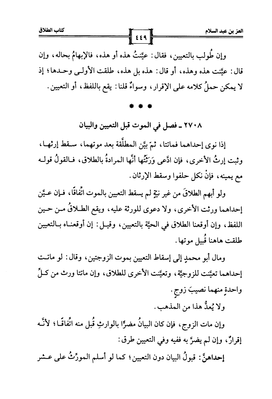 ومال أبو محمدٍ إلى إسقاط التعيين بموت الزوجتين، وقال: لو ماتت إحداهما تعيَّنت للزوجيَّة، وتعيَّنت الأخرى للطلاق، وإن ماتتا ورث من كلِّ واحدةٍ منهما نصيبَ زوجٍ.