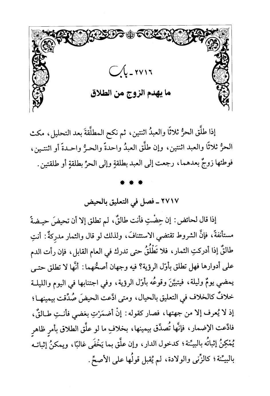 إذا طلَّق الحرُّ ثلاثًا والعبدُ اثنتين، ثم نكح المطلَّقةَ بعد التحليل، مكث الحرُّ ثلاثًا والعبد اثنتين، وإِن طلَّق العبدُ واحدةً والحرُّ واحدةً أو اثنتين، فوطئها زوجٌ بعدهما، رجعت إلى العبد بطلقةٍ وإلى الحرِّ بطلقةٍ أو طلقتين.