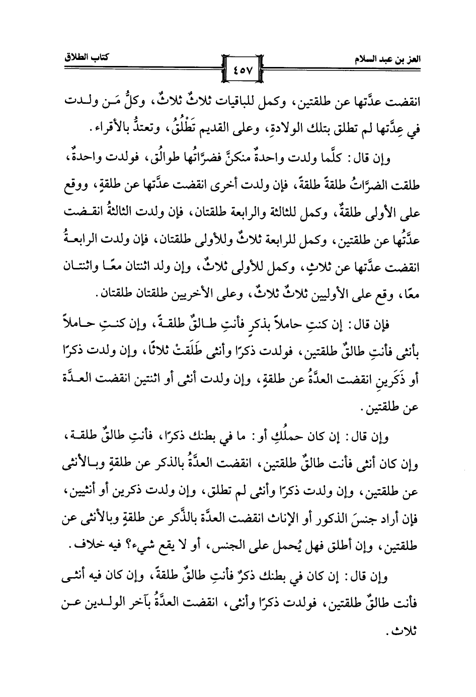 وإِن قال: إن كان حملُكِ أو: ما في بطنك ذكرًا، فأنتِ طالقٌ طلقة، وإِن كان أنثى فأنت طالقٌ طلقتين، انقضت العدَّةُ بالذكر عن طلقةِ وبالأنثى عن طلقتين، وإِن ولدث ذكرًا وأنثى لم تطلق، وإِن ولدت ذكرين أو أنثيين، فإن أراد جنسَ الذكور أو الإناث انقضث العدَّة بالذَّكر عن طلقةٍ وبالأنثى عن طلقتين، وإِن أطلق فهل يُحمل على الجنس، أو لا يقع شيء؟ فيه خلاف.