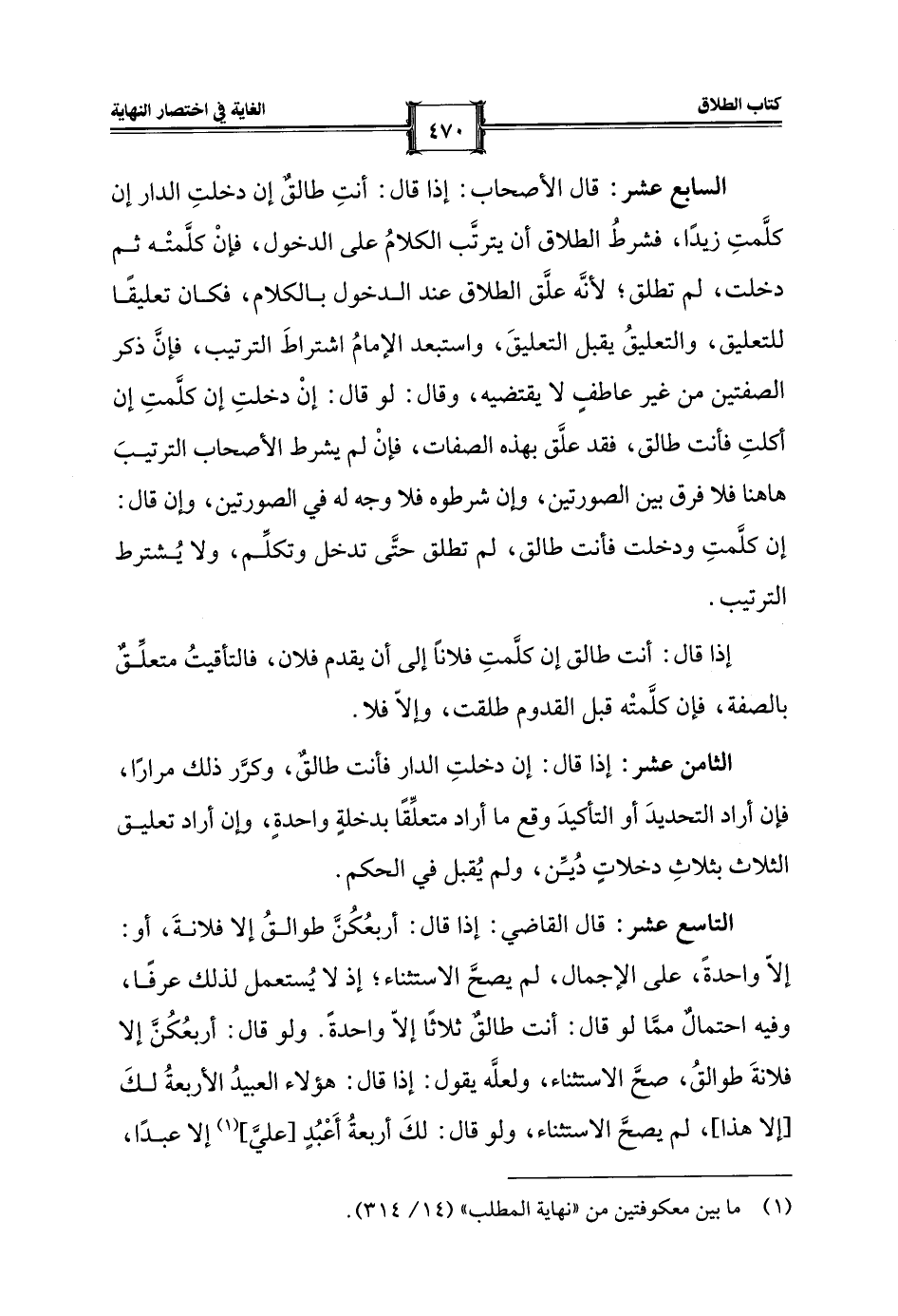 السابع عشر: قال الأصحاب: إذا قال: أنتِ طالقٌ إن دخلتِ الدار إن كلَّمتِ زيدًا، فشرطُ الطلاق أن يترتَّب الكلامُ على الدخول، فإنْ كلَّمتْه ثم دخلت، لم تطلق؛ لأنَّه علَّق الطلاق عند الدخول بالكلام، فكان تعليقًا للتعليق، والتعليقُ يقبل التعليقَ، واستبعد الإمامُ اشتراطَ الترتيب، فإنَّ ذكر الصفتين من غير عاطفٍ لا يقتضيه، وقال: لو قال: إنْ دخلتِ إن كلَّمتِ إن أكلتِ فأنت طالقٌ، فقد علَّق بهذه الصفات، فإنْ لم يشرط الأصحاب الترتيبَ هاهنا فلا فرق بين الصورتين، وإِن شرطوه فلا وجه له في الصورتين، وإِن قال: إن كلَّمتِ ودخلت فأنت طالقٌ، لم تطلق حتَّى تدخل وتكلِّم، ولا يُشترط الترتيب.