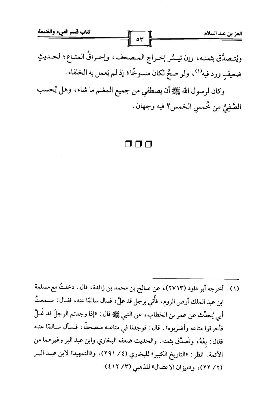 (¬1) أخرجه أبو داود (2713)، عن صالح بن محمد بن زائدة، قال: دخلتُ مع مسلمة بن عبد الملك أرض الروم، فأُتي برجل قد غلَّ، فسأل سالمًا عنه، فقال: سمعتُ أبي يُحدِّث عن عمر بن الخطاب، عن النبي -صلى الله عليه وسلم- قال: "إذا وجدتم الرجلَ قد غَلَّ فأحرقوا متاعه وأضربوه". قال: فوجدنا في متاعه مصحفًا، فسال سالمًا عنه فقال: بِعْهُ، وتَصدَّق بثمنه. والحديث ضعفه البخاري وابن عبد البر وغيرهما من الأئمة. انظر: "التاريخ الكبير" للبخاري (4/ 291)، و"التمهيد" لابن عبد البر (2/ 22)، و"ميزان الاعتدال" للذهبي (3/ 412).