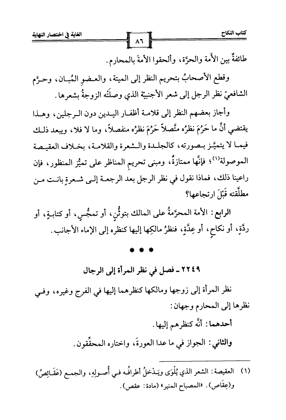 وأجاز بعضهم النظر إلى قلامة أظفار اليدين دون الرجلين، وهذا يقتضي أنَّ ما حَرُمَ نظرُه متَّصلًا حَرُمَ نظرُه منفصلًا، وما لا فلا، ويبعد ذلك فيما لا يتميَّز بصورته، كالجلدة والشعرة والقلامة، بخلاف العقيصة الموصولة (¬1)؛ فإنَّها ممتازةٌ، ومبنى تحريمِ المناظر على تميُّز المنظور، فإن راعينا ذلك، فماذا نقول في نظر الرجل بعد الرجعة إلى شعرةٍ بانت من مطلَّقته قَبْلَ ارتجاعها؟