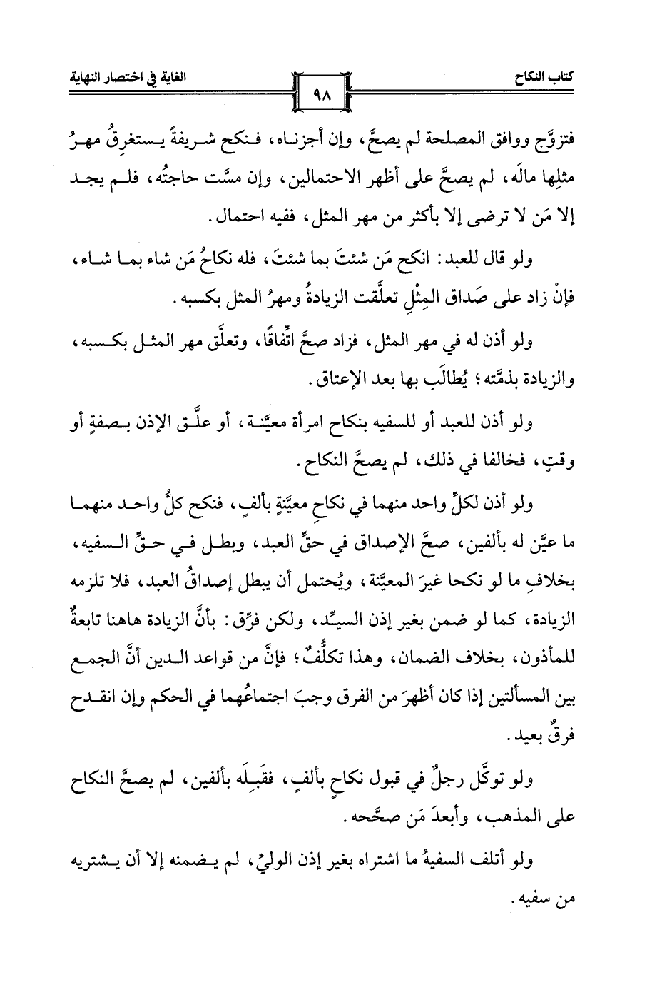 ولو أذن لكلِّ واحد منهما في نكاحِ معيَّنةٍ بألفٍ، فنكح كلُّ واحد منهما ما عيَّن له بألفين، صحَّ الإصداق في حقِّ العبد، وبطل في حقِّ السفيه، بخلافِ ما لو نكحا غيرَ المعيَّنة، ويُحتمل أن يبطل إصداقُ العبد، فلا تلزمه الزيادة، كما لو ضمن بغير إذن السيِّد، ولكن فرِّق: بأنَّ الزيادة ها هنا تابعةٌ للمأذون، بخلاف الضمان، وهذا تكلُّفٌ؛ فإنَّ من قواعد الدين أنَّ الجمع بين المسألتين إذا كان أظهرَ من الفرق وجبَ اجتماعُهما في الحكم وإن انقدح فرقٌ بعيد.