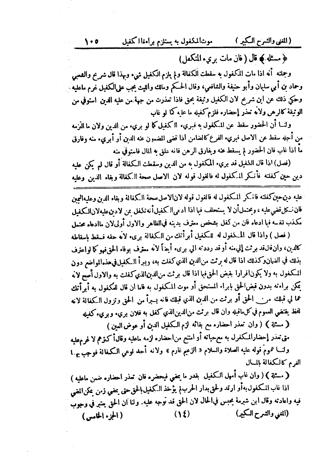 يمكن براءته بدون قبض الحق بإبراء المستحق أو موت المكفول به فأما إن قال للمكفول به أبر أتك عمالي قبلك من الحق أو برئت من الدين الذي قبلك فانه يبرأ من الحق وتزول الكفالة لانه لفظ يقتضي العموم في كل ما قبله وإن قال برئت من الدين الذي كفل به فلان برئ وبرئ كفيله (مسألة) (وإن تعذر إحضاره مع بقائه لزم الكفيل الدين أو عوض العين) متى تعذر إحضار المكفرل به مع حياته أو امتنع من إحضاره لزمه ما عليه وقال أكثرهم لا غرم عليه ولنا عموم قوله عليه الصلاة والسلام (الزعيم غارم) ولأنه أحد نوعي الكفالة فوجب بهما الغرم كالكفالة بالمال (مسألة) (وإن غاب أمهل الكفيل بقدر ما يمضي فيحضره فإن تعذر إحضاره ضمن ما عليه) إذا غاب المكفول به او ارتد ولحق بدار الحرب لم يؤخذ الكفيل بالحق حتى يمضي زمن يمكن المضي فيه وإعادته وقال ابن شبرمة يحبس في الحال لأن الحق قد توجه عليه.