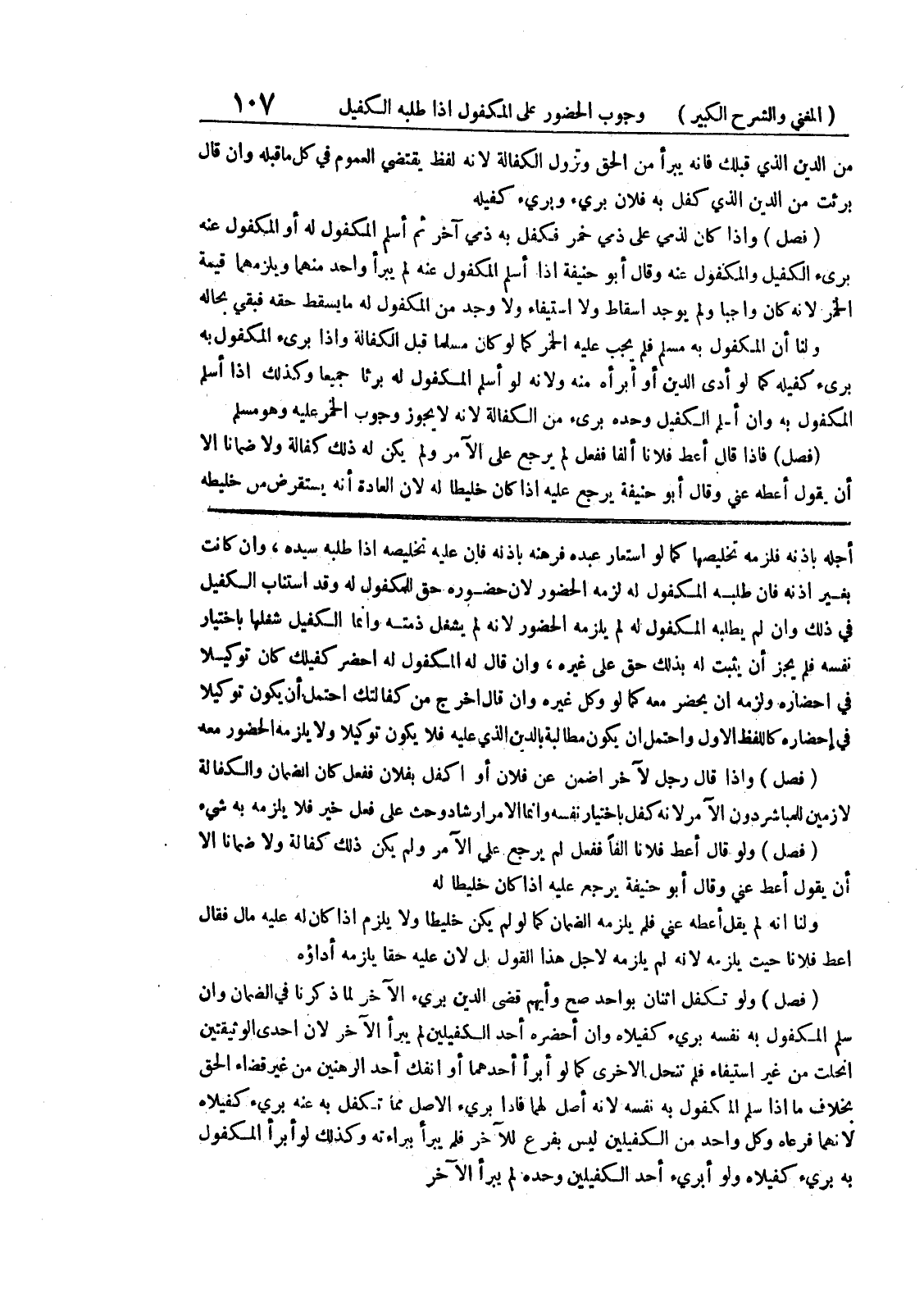 أجله اذنه فلزمه تخليصها كما لو استعار عبده فرهنه بإذنه فإن عليه تخليصه إذا طلبه سيده، وإن كانت بغير إذنه فإن طلبه المكفول له لزمه الحضور لأن حضوره حق للمكفول له وقد استناب الكفيل في ذلك وإن لم يطلبه المكفول له لم يلزمه الحضور لأنه لم يشغل ذمته وإنما الكفيل شغلها باختيار نفسه فلم يجز أن يثبت له بذلك حق على غيره، وإن قال له المكفول له احضر كفيلك كان توكيلاً في إحضاره ولزمه أن يحضر معه كما لو وكل غيره وإن قال أخرج من كفالتك احتمل أن يكون توكيلاً في إحضاره كاللفظ الأول واحتمل أن يكون مطالبة بالدين الذي عليه فلا يكون توكيلاً ولا يلزمه الحضور معه (فصل) وإذا قال رجل لآخر أضمن عن فلان أو أكفل بفلان ففعل كان الضمان والكفالة لازمين للمباشر دون الآمر لأنه كفل باختيار نفسه وإنما الأمر إرشاد وحث على فعل خير فلا يلزمه به شئ (فصل) ولو قال أعط فلانا ألفاً ففعل لم يرجع على ألآمر ولم يكن ذلك كفالة ولا ضمانا إلا أن يقول أعط عني وقال أبو حنيفة يرجع عليه إذا كان خليطاً له ولنا أنه لم يقل أعطه عني فلم يلزمه الضمان كما لو لم يكن خليطا ولا يلزم إذا كان له عليه مال فقال أعط فلانا حيث يلزمه لأنه لم يلزمه لا جل هذا القول بل لأن عليه حقا يلزمه أداؤه (فصل) ولو تكفل اثنان بواحد صح وأيهم قضى الدين برئ الآخر لما ذكرنا في الضمان وإن