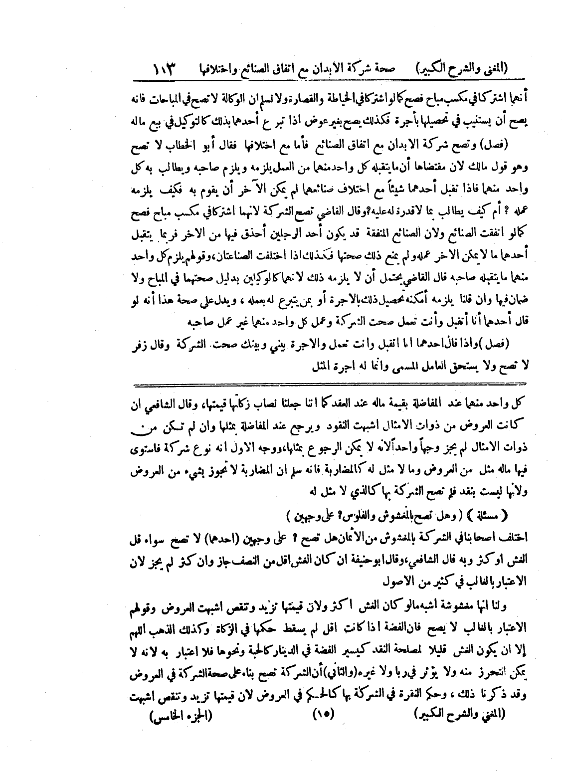 كل واحد منهما عند المفاضلة بقيمة ماله عند العقد كما إننا جعلنا نصاب زكاتها قيمتها، وقال الشافعي إن كانت العروض من ذوات الأمثال أشبهت النقود ويرجع عند المفاضلة بمثلها وإن لم تكن من ذوات الأمثال لم يجز وجهاً واحداً لأنه لا يمكن الرجوع بمثلها، ووجه الأول أنه نوع شركة فاستوى فيها ماله مثل من العروض ومالا مثل له كالمضاربة فإنه سلم ان المضاربة لا تجوز بشئ من العروض ولأنها ليست بنقد فلم تصح الشركة بها كالذي لا مثل له (مسألة) (وهل تصح بالمغشوش والفلوس؟ على وجهين)