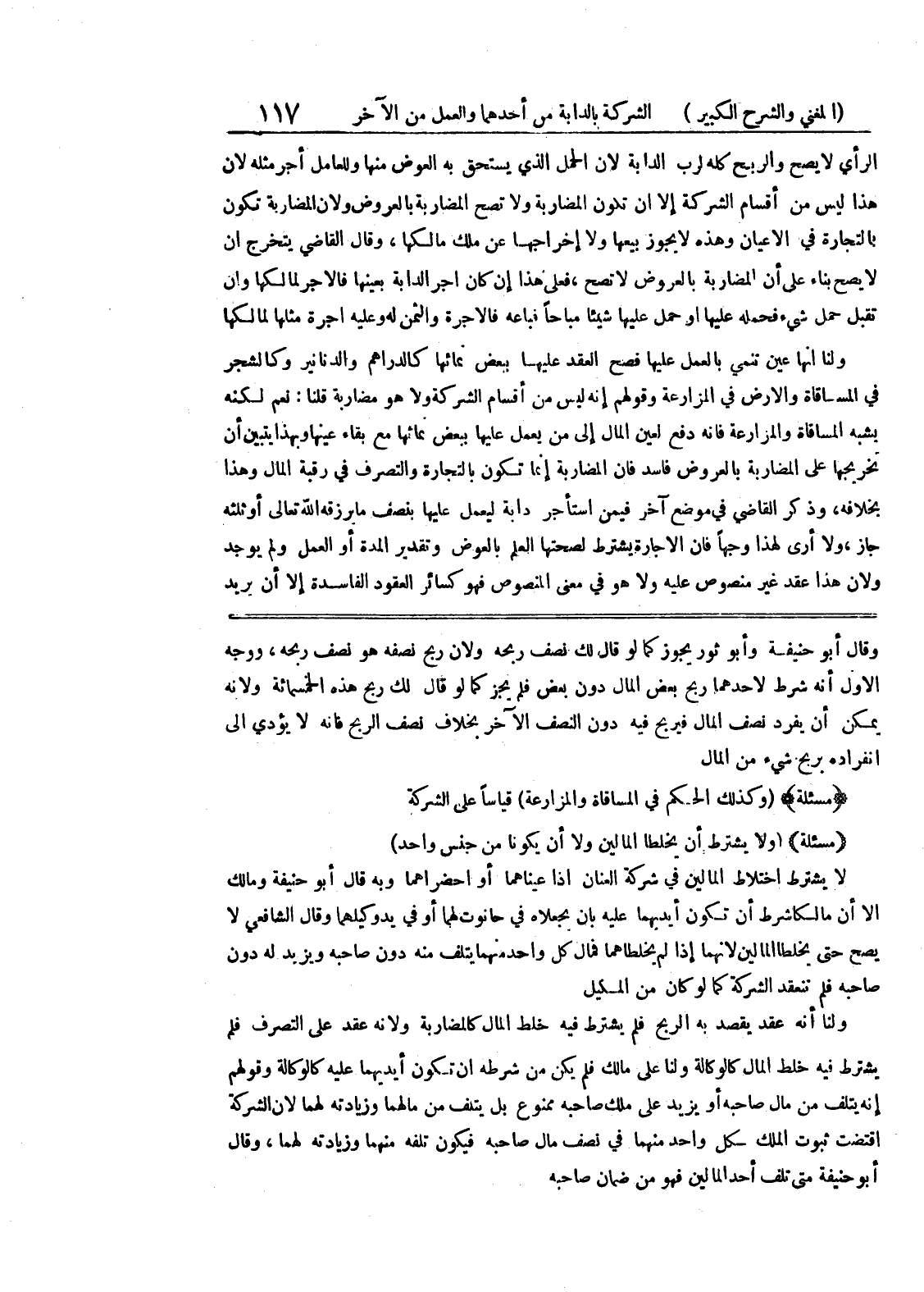 وقال أبو حنيفة وأبو ثور يجوز كما لو قال لك نصف ربحه ولأن ربح هو نصف ربحه، ووجه الأول أنه شرط لأحدهما ربح بعض المال دون بعض فلم يجز كما لو قال لك ربح هذه الخمسمائة ولأنه يمكن أن يفرد نصف المال فيربح فيه دون النصف الآخر بخلاف نصف الربح فإنه لا يؤدي إلى انفراده بربح شئ من المال (مسألة) (وكذلك في المساقاة والمزارعة) قياساً على الشركة (مسألة) (ولا يشترط أن يخطا المالين ولا أن يكونا من جنس واحد) لا يشترط اختلاط المالين في شركة العنان إذا عيناهما أو أحضراهما وبه قال أبو حنيفة ومالك إلا أن مالكا شرط أن تكون أيدهما عليه بأن يجعلاه في حانوت لهما أفي يدو كيلهما وقال الشافعي لا يصح حتى يخلطا المالين لأنهما إذا لم يخلطا هما فمال كل واحد منهما يتلف منه دون صاحبه ويزيد له دون صاحبه فلم تنعقد الشركة كما لو كان من المكيل ولنا أنه عقد يقصد به الربح فلم يشترط فيه خلط المال كالمضاربة ولأنه عقد على التصرف فلم يشترط فيه خلط المال كالوكالة ولنا على مالك فلم يكن من شزطه أن تكون أيديهما عليه كالوكالة وقولهم إنه يتلف من مال صاحبه أو يزيد على ملك صاحبه بل يتلف من مال لهما وزيادته لهما لأن الشركة