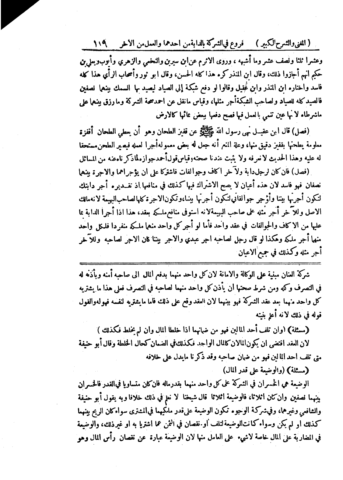 (مسألة) (وإن تلف أحد المالين فهو من ضمانهما إذا خلطا المال وإن لم يخلط فكذلك) لأن العقد اقتضى أن يكون المالان كالمال الواحد فكذك في الضمان كحال الخلطة وقال أبو حنيفة متى تلف أحد المالين فهو من ضمان صاحبه وقد ذكرنا ما يدل على خلافه (مسألة) (والوضيعة على قدر المال) الوضعية هي الخسران في الشركة على كل واحد منهما بقدر ماله فإن كان متساوياً في القدر فالخسران بينهما نصفين وإن كان أثلاثاً، فالوضيعة أثلاثاً قال شيخنا لا نعلم في ذلك خلافاً وبه يقول أبو حنيفة والشافعي وغيرهما، وفي شركة الوجوه تكون الوضيعة على قدر ملكيهما في الشمترى سواء كان الربح بينهما كذلك أو لم يكن وسواء كانت الوضيعة لتلف أو نقصان في الثمن عما اشتريا به أو غير ذلك، والوضيعة في المضاربة على المال خاصة لا شئ على العامل منها لأن الوضيعة عبارة عن نقصان رأس المال وهو