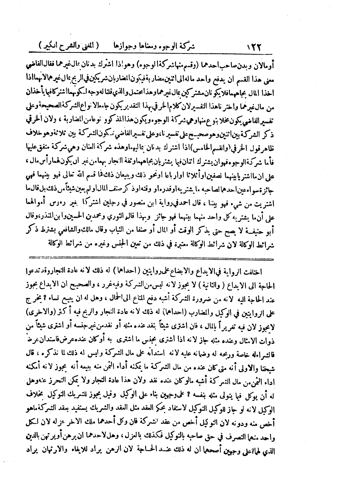 على الروايتين في الوكيل والمضارب (إحداهما) له ذلك لأنه عادة النجار والربح فيه أكثر (والأخرى) لا يجوز لأن فيه تغريراً بالمال، فإن اشترى شيئاً بنقد عنده مثله أو نقدمن غير جنسه أو اشترى شيئاً من ذوات الأمثال وعنده مثله جاز لأنه إذا اشترى بجنس ما اشترى به أو كان عنده عرض فاستدان عرض فالشراء له خاصة وربحه له وضمانه عليه لأنه استدانه على مال الشركة وليس له ذلك لما نذكره، قال شييخنا والأولى أنه متى كان عنده من مال الشركة ما يمكنه أداء الثمن منه ببيعه أنه يجوز لأنه أمكنه إداء الثمن من مال الشركة أشبه ما لو كان عنده نقد ولأن هذا عادة التجار ولا يكمن التحرز عنه وهل له أن يوكل فيما يتولى مثله بنفسه؟ على وجهين بناء على الوكيل وقيل يجوز للشريك التوكيل بخلاف الوكيل لأنه لو جاز للوكيل التوكيل لاستفاد بحكم العقد مثل العقد والشريك يستفيد بعقد الشركة ما هو أخص منه ودونه لا التوكيل أخص من عقد الشركة فإن وكل أحدهما ملك الآخر عزله لأن لكل واحد منهما التصرف في حق صاحبه التوكيل فكذلك بالعزل، وهل لأحدهما أن يرهن أو يرتهن بالدين الذي لهم؟ على وجهين أصحهما أن له ذلك عند الحاجة لأن الرهن يراد للإيفاء والإرتهان يراد
