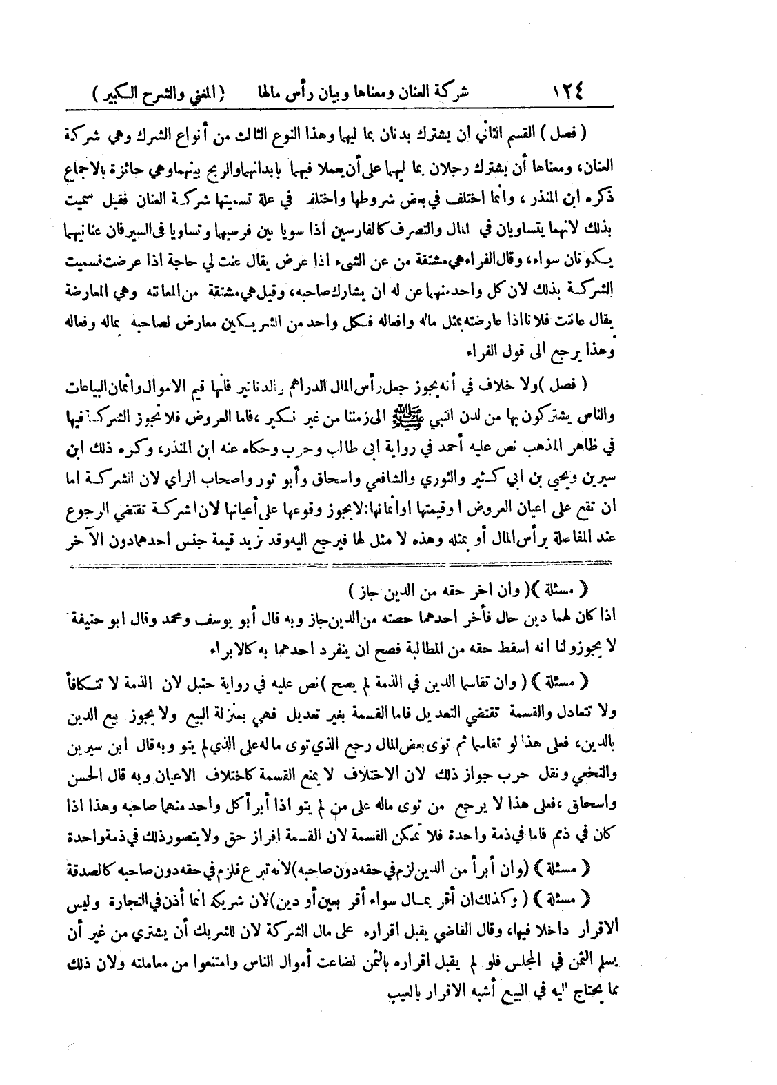 (مسألة) (وإن أخر حقه من الدين جاز) إذا كان لهما دين حال فأخر أحدهما حصته من الدين جاز وبه قال أبو يوسف ومحمد وقال أبو حنيفة لا يجوز ولنا أنه اسقط حقه من المطالبة فصح أن ينفرد أحدهما به كالإبراء (مسألة) (وإن تقاسما الدين في الذمة لم يصح) نص عليه في رواية حنبل لأن الذمة لا تتكافأ ولا تتعاد ل والقسمة تقتضي التعد يل فأما القسمة بغير تعديل فهي بمنزلة البيع ولايجوز بيع الدين بالدين، فعلى بالدين، فعلى هذا لو تقاسما ثم توى بعض المال رجع الذي توى ماله على الذي لم يتوو به قال ابن سيرين والنخعي ونقل حرب جواز ذلك لأن الاختلاف لا يمنع القسمة كاختلاف الأعيان وبه قال الحسن واسحاق، فعلى هذا لا يرجع من توى ماله على من لم يتو إذا أبرأ كل واحد منهما صاحبه وهذا إذا كان في ذمم فاما في ذمة واحدة فلا تمكن القسمة لأن القسمة إفراز حق ولا يتصور ذلك في ذمة وحده (مسألة) (وإن أبرأ من الدين لزم في حقه دون صاحبه) لأنه تبرع فلزم في حقه دون صاحبه كالصدقة (مسألة) (وكذلك إن أقر بمال سواء أقر بعين أو دين) لأن شريكه إنما أذن في التجارة وليس الإقرار داخلا فيها، وقال القاضي يقبل إقراره على مال الشركة لأن للشريك أن يشتري من غير أن يسلم الثمن في المجلس فلو لم يقبل إقراره بالثمن لضاعت أموال الناس وامتنعوا من معاملته ولأن ذلك مما يحتاج إليه في البيع اشبه الإقرار بالعيب