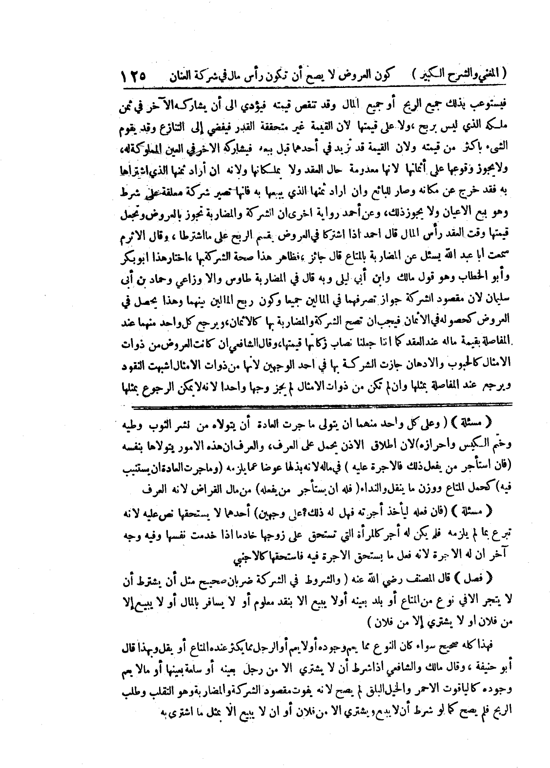 (فن استأجر من يفعل ذلك فالإجرة عليه) في ماله لأنه بذلها عوضاً عما يلزمه (وما جرت العادة أن يستنيب فيه) كحمل المتاع ووزن ما ينقل والنداء (فله أن يستأجر من يفعله) من مال القراض لأنه العرف (مسألة) (فإن فعله ليأخذ أحرته فهل له ذلك؟ على وجهين) أحدهما لا يستحقها نص عليه لأنه تبرع بما لم يلزمه فلم يكن له أجر كالمرأة التي تستحق على زوجها خادماً إذا خدمت نفسها وفيه وجه آخر أن له الإجرة لأنه فعل ما يستحق الإجرة فيه فاستحقها كالأجنبي (فصل) قال المصنف رضي الله عنه (والشروط في الشركة ضربان صحيح مثل أن يشترط أن لا يتجر الافي نوع من المتاع أو بلد بعينه أو لا يبيع إلا بنقد معلوم أو لا يسافر بامال أو لا يبيع إلا من فلان أو لا يشتري إلا من فلان) فهذا كله صحيح سواء كان النوع مما يعم وجوده أو لا يعم أو الرجل مما يكثر عنده المتاع أو يقل وبهذا قال أبو حنيفة، وقال مالك والشافعي إذا شرط أن لا يشتري إلا من رجل بعينه أو سلعة بعينها أو مالا يعم وجوده كالياقوت الأحمر والخيل البلق لم يصح لأنه يفوت مقصود الشركة والمضاربة وهو التقلب وطلب الربح فلم يصح كما لو شرط أن لا يبيع ويشتري إلا من فلان أو أن لا يبيع إلا بمثل ما اشترى به