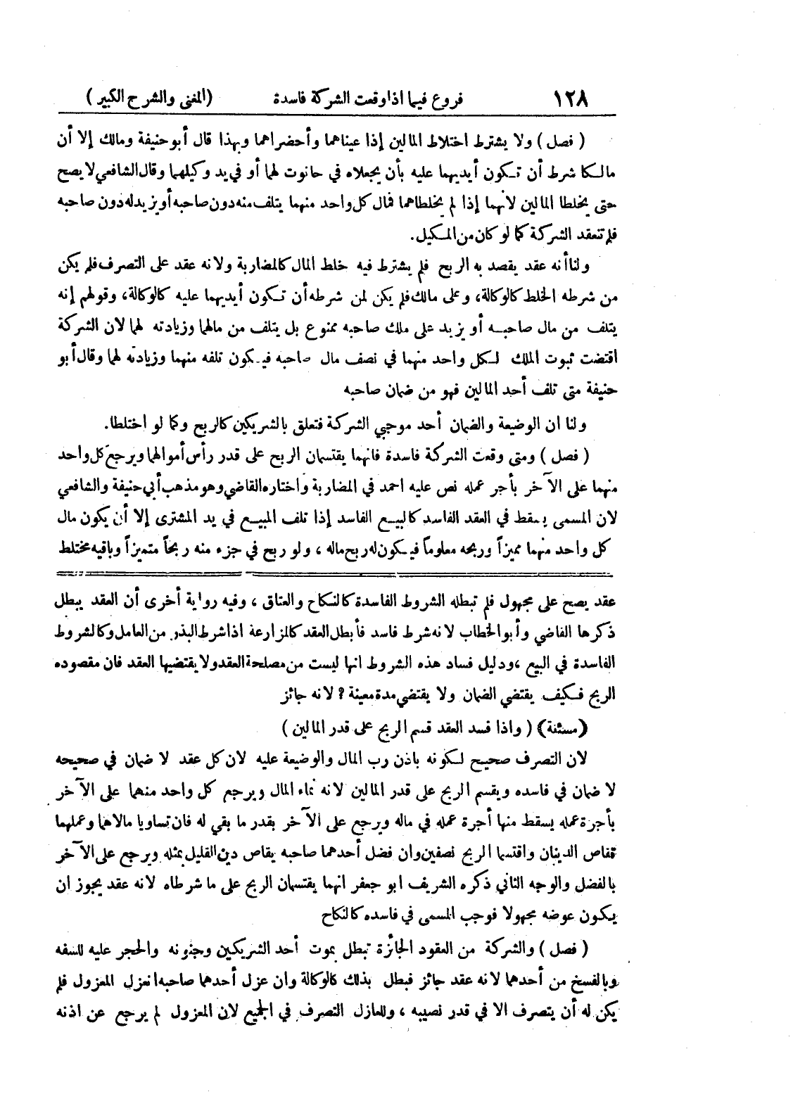 الفاسدة في البيع، ودليل فساد هذه الشروط أنها ليست من مصلحة العقد ولا يقتضيها العقد فإن مقصوده الربح فكيف يقتضي الضمان ولا يقتضي مدة معينة؟ لأنه جائز (مسألة) (وإذا فسد العقد قسم الربح على قدر المالين) لأن التصرف صحيح لكونه بإذن رب المال والوضيعة عليه لأن كل عقد لا ضمان في صحيحه لا ضمان في فاسدة ويقسم الربح على قدر المالين لأنه نماء المال ويرجع كل واحد منهما على الآخر بأجرة عمله يسقط منها أجرة عمله في ماله ويرجع على الآخر بقدر ما بقي له فإن تساويا مالاهما وعملهما فقاص الدينان واقتسما الربح نصفين وإن فضل أحدهما صاحبه يقاص دين القليل بمثله ويرجع على الآخر بالفضل والوجه الثاني ذكر الشريف أبو جعفر انهما يقتسان الربح على ما شرطاه لأنه عقد يجوز أن يكون عوضه مجهولا فوجب المسمى في فاسده كالنكاح (فصل) والشركة من العقود الجائزة تبطل بموت أحد الشريكين وجنونه والحجر عليه للسفه بالفسخ من أحدهما لأنه عقد جائز فبطل بذلك كالوكالة وإن عزل أحدهما صاحبه انعزل المعزول فلم يكن له أن يتصرف إلا في قدر نصيبه، وللعازل التصرف في الجميع لأن المعزول لم يرجع عن إذنه