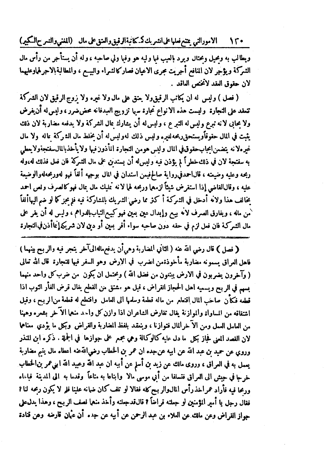 وذكره ابن المنذر روي وعن حميد بن عبد الله عن أبيه عن جده أن عمر بن الخطاب رضي الله عنه أعطاه مال يتيم مضاربة يعمل به في العراق، وروى مالك عن زيد بن أسلم عن أببه أن عبد الله وعبيد الله ابي عمر بن الخطاب خرجا في حيش الى العراق فتسلفا من أبي موسى مالا وابتاعا به متاعاً وقد ما به الى المدينة فباعاه وربحا فيه فأراد عمر أخذ رأس المال والربح كله فقالا لو تلف كان ضامنه علينا فلم يكون ربحه لنا؟ فقال رجل يا أمير المؤمنين لو جعلته قراضاً؟ قال قد جعلته وأخذ منهما نصف الربح، وهذا يدل على جواز القراض وعن مالك عن العلاء بن عبد الرحمن عن أبيه عن جده أن عثمان قارضه وعن قتادة