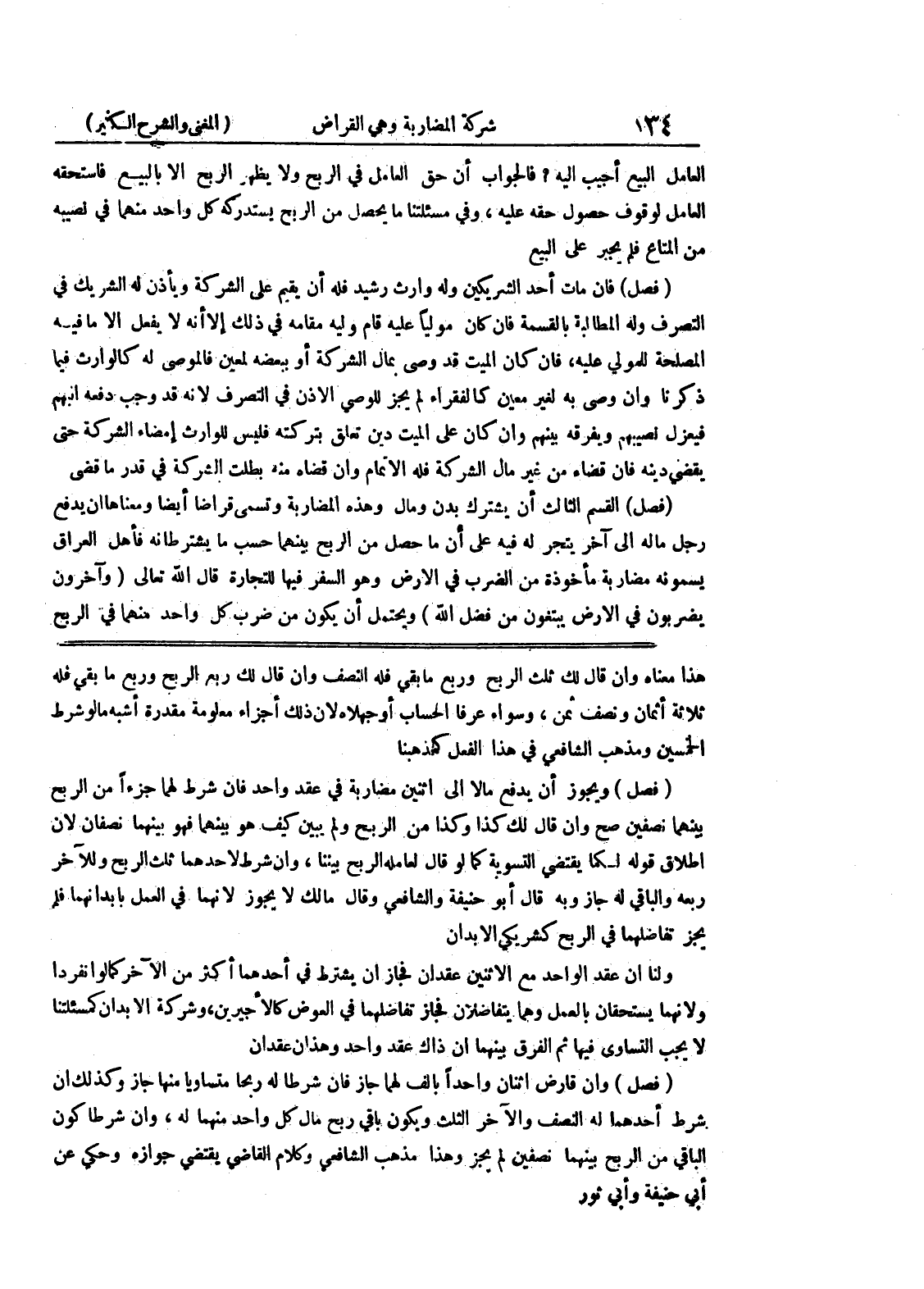 هذا معناه وإن قال لك ثلث الربح وربع وما بقي فله النصف وإن قال لك ربع الربح وربع ما بقي فله ثلاثة أثمان ونصف ثمن، وسواء عرفا الحساب أو جهلاه لان ذلك أجزاء معلومة مقدرة أشبه مالو شرط الخمسين ومذهب الشافعي في هذا الفعل كمذهبنا (فصل) ويجوز أن يدفع مالا إلى إثنين مضاربة في عقد واحد فإن شرط لهما جزءاً من الربح بينهما نصفين صح وإن قال لك كذا وكذا من الربح ولم يبين كيف هو بينهما فهو بينهما نصفان لأن إطلاق قوله لكما يقتضي التسوية كما لو قال لعامله الربح بيننا، وإن شرط لأحدهما ثلث الربح وللآخر ربعه والباقي له جاز وبه قال أبو حنيفة والشافعي وقال مالك لا يجوز لأنهما في العمل بأبدانهما فلم يجز تفاضلهما في الربح كشريكي الإبدان ولنا أن عقد الواحد مع الاثنين عقدان فجاز أن يشترط في أحدهما أكثر من الآخر كما لو انفردا ولأنهما يستحقان بالعمل وهما يتفاضلان فجاز تفاضلهما في العوض كالأجيرين، وشركة الا بدان كمسئلتنا لا يجب التساوي فيها ثم الفرق بينهما أن ذاك عقد واحد وهذا عقدان (فصل) وإن قارض إثنان واحداً بألف لهما جاز فإن شرطا له ربحاً متساوياً منها جازوكذلك ان بشرط أحدهما له النصف والآخر الثلث ويكون باقي ربح مال كل واحد منهما له، وإن شرطا كون الباقي من الربح بينهما نصفين لم يجز وهذا مذهب الشافعي وكلام القاضي يقتضي جوازه وحكي عن أبي حنيفة وأبى ثور