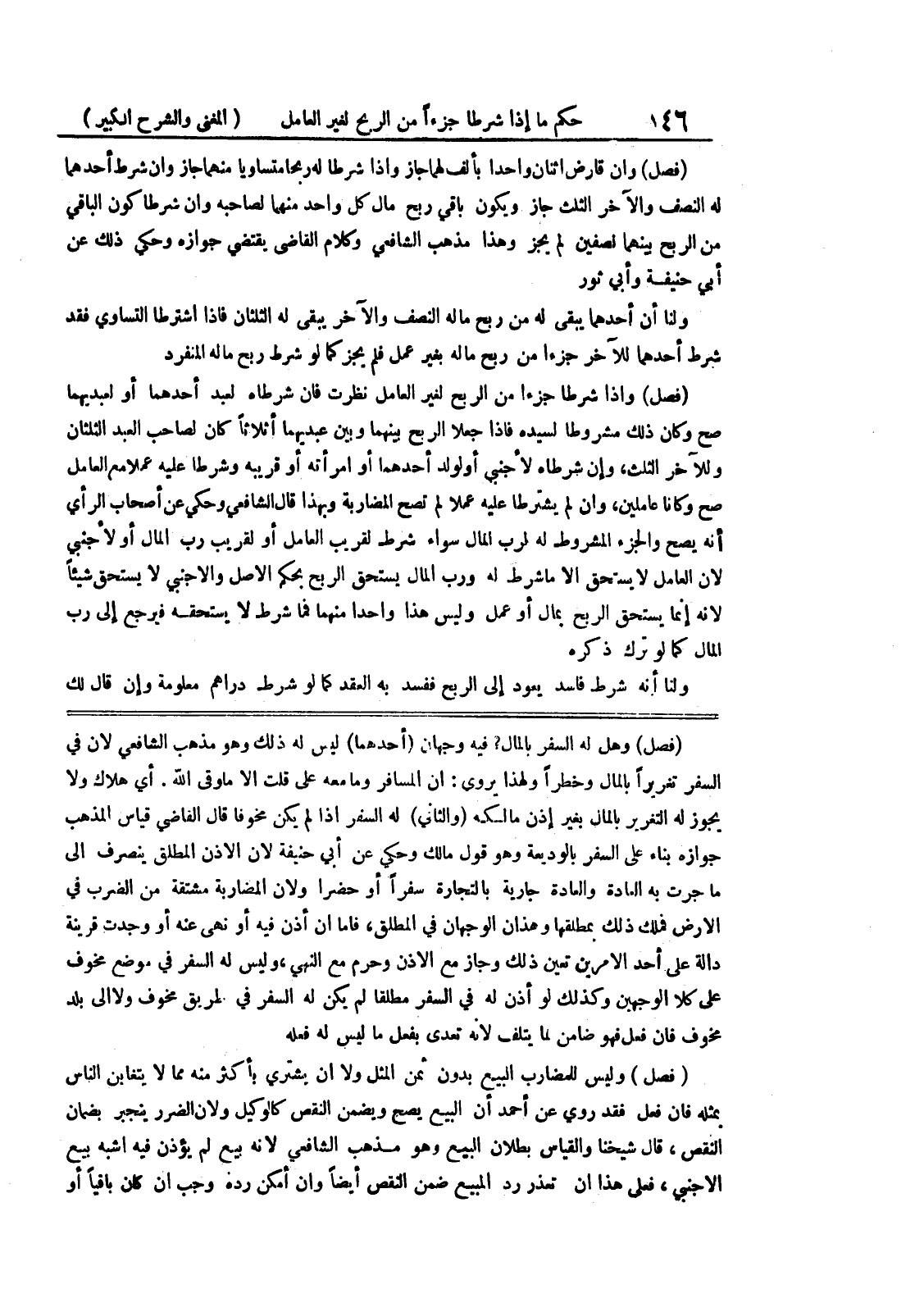 جوازه بناء على السفر بالوديعة وهو قول مالك وحكي عن أبي حنيفة لأن الإذن المطلق ينصرف الى ما جرت به العادة والعادة جارية بالتجارة سفراً أو حضراً ولأن المضاربة مشتقة من الضرب في الأرض فملك ذلك بمطلقها وهذان الوجهان في المطلق، فأما إن أذن فيه أو نهى عنه أو وجدت قرينة دالة على أحد الأمرين تعين ذلك وجاز مع الإذن وحرم مع النبي، وليس له السفر في موضع مخوف على كلا الوجهين وكذلك لو أذن له في السفر مطلقاً لم يكن له السفر في طريق مخوف ولا إلى بلد مخوف فإن فعل فهو ضامن لما يتلف لأنه تعدى بفعل ما ليس له فعله (فصل) وليس للمضارب البيع بدون ثمن المثل ولا أن يشتري بأكثر منه مما لا يتغابن الناس بمثله فان فعل فقد روي عن أحمد أن البيع يصح ويضمن النقص كالو كيل ولأن الضرر ينجبر بضمان النقص، قال شيخنا والقياس بطلان البيع وهو مذهب الشافعي لأنه بيع لم يؤذن فيه أشبه بيع الأجنبي، فعلى هذا إن تعذر رد المبيع ضمن النقص أيضاً وإن أمكن رده وجب إن كان باقيا أو