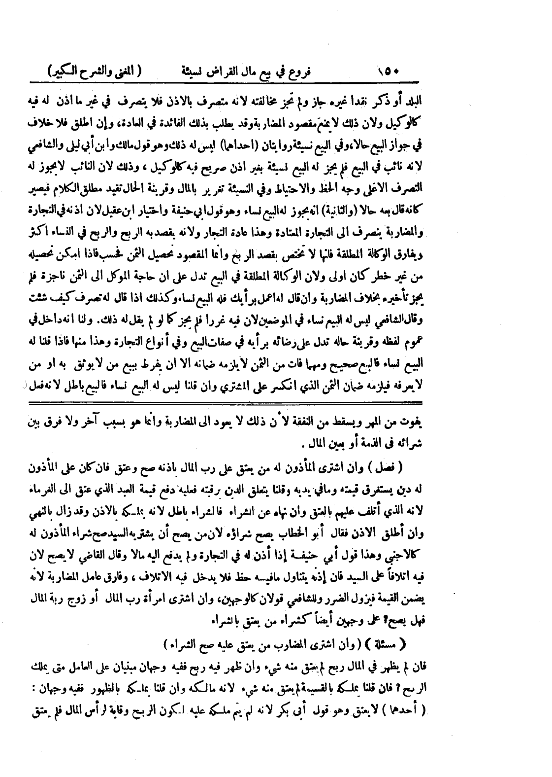 (فصل) وإن اشترى المأذون له من يعتق على رب المال بإذنه صح وعتق فإن كان على المأذون له دين يستغرق قيمته وما في يديه وقلنا يتعلق الدين برقبته فعليه دفع قيمة العبد الذي عتق الى الغرماء لأنه الذي أتلف عليهم بالعتق وإن نهاه عن الشراء فالشراء باطل لأنه يملكه بالإذن وقد زال بالنهي وإن أطلق الاذن فقال أبو الخطاب يصح شراؤه لأن من يصح أن يشتريه السيد صح شراء المأذون له كالأجنبي وهذا قول أبي حنيفة إذا أذن له في التجارة ولم يدفع إليه مالا وقال القاضي لا يصح لأن فيه إتلافاً على السيد فإن إذنه يتناول ما فيه حظ فلا يدخل فيه الإتلاف، وفارق عامل المضاربة لأنه يضمن القيمة فيزول الضرر وللشافعي قولان كالوجهين، وإن اشترى إمراة رب المال أو زوج ربة المال فهل يصح؟ على وجهين أيضاً كشراء من يعتق بالشراء (مسألة) (وإن اشترى المضارب من يعتق عليه صح الشراء)