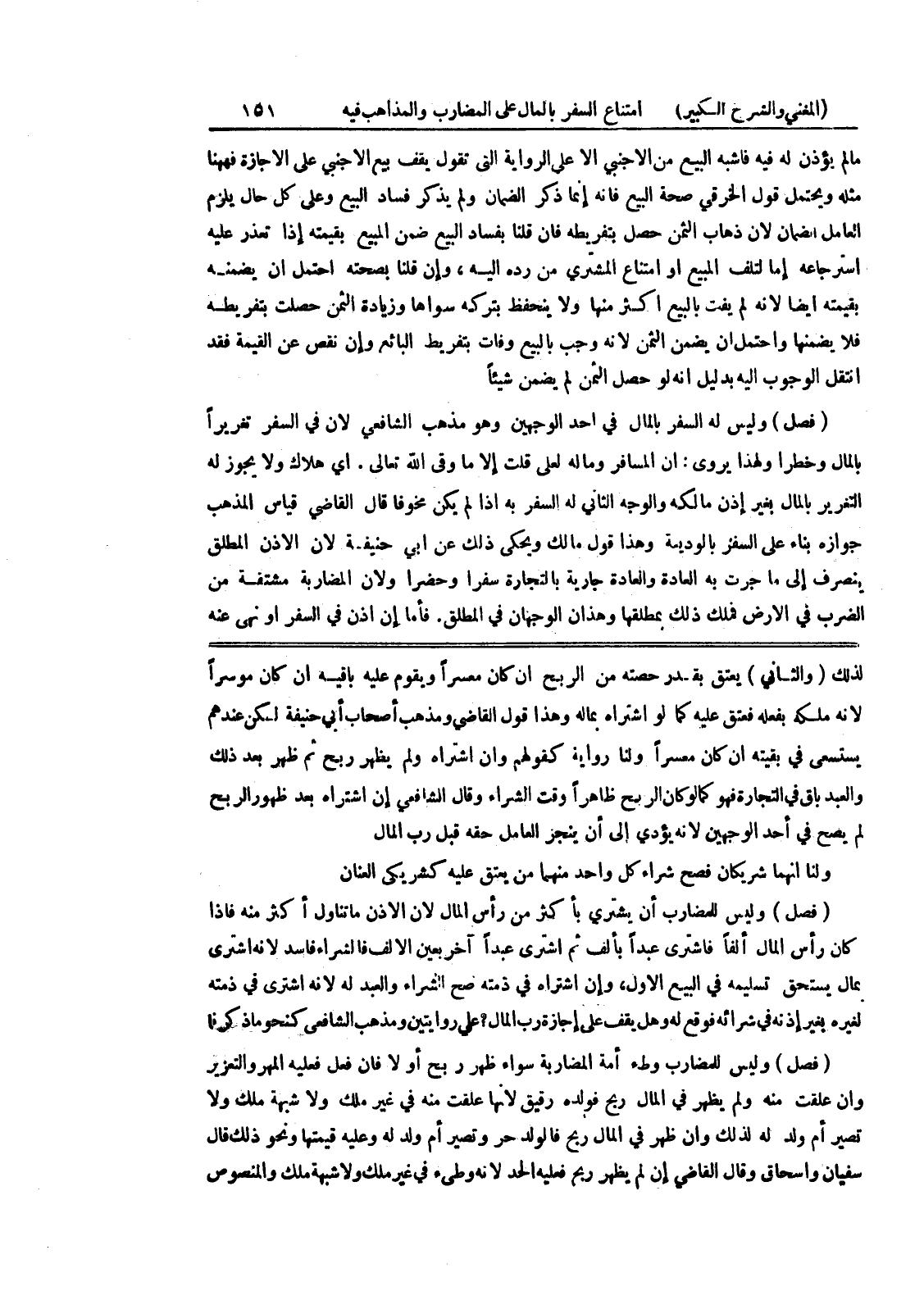 لذلك (والثاني) يعتق بقدر حصته من الربح إن كان معسراً ويقوم عليه باقيه إن كان موسراً لأنه ملكه بفعله فعتق عليه كما لو اشتراه بماله وهذا قول الفاضي ومذهب أصحاب أبي حنيفة لكن عندهم يستسعى في بقيته إن كان معسراً ولنا رواية كقولهم وإن اشتراه ولم يظهر ربح ثم ظهر بعد ذلك والعبد باق في التجارة فهو كما لو كان الربح ظاهراً وقت الشراء وقال الشافعي إن اشتراه بعد ظهور الربح لم يصح في أحد الوجهين لأنه يودي إلى أن ينجر العامل حقه قبل رب المال ولنا أنهما شريكان فصح شراء كل واحد منهما من يعتق عليه كشريكي العنان (فصل) وليس للمضارب أن يشتري بأكثر من رأس المال لأن الإذن ما تناول أكثر منه فإذا كان رأس المال ألفاً فاشترى عبداً بألف ثم اشترى عبداً آخر بعين الألف فالشراء فاسد لأنه اشترى بمال يستحق تسليمه في البيع الأول، وإن اشتراه في ذمته صح الشراء والعبد له لأنه إشترى في ذمته لغيره بغير إذنه في شرائه فوقع له وهل يقف على إجازة رب المال؟ على روايتين ومذهب الشافعي كنحو ما ذكرنا (فصل) وليس للمضارب وطئ أمة المضاربة سواء ظهر ربح أو لا فإن فعل فعليه المهر والتعزير وإن علقت منه ولم يظهر في المال ربح فولده رقيق لأنها علقت منه في غير ملك ولا شبهة ملك ولا تصير أم ولد له لذلك وإن ظهر في المال ربح فالولد حر وتصير أم ولد له وعليه قيمتها ونحو ذلك قال سفيان واسحاق وقال القاضي إن لم يظهر ريح فعليه الحد لأنه وطئ في غير ملك ولا شبهة ملك والمنصوص