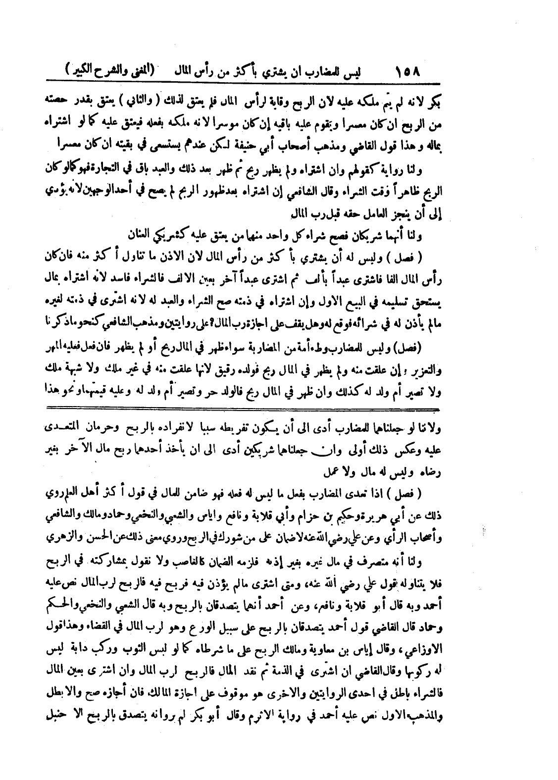 عليه وعكس ذلك أولى وان جعلنا هما شريكين أدى الى أن يأخذ أحدهما ربح مال الآخر بغير رضاه وليس له مال ولا عمل (فصل) إذا تعدى المضارب بفعل ما ليس له فعله فهو ضامن للمال في قول أكثر أهل العلم روي ذلك عن أبي هريرة وحكم بن حزام وأبي قلابة ونافع واياس والشعبي والنخعي وحماد ومالك والشافعي وأصحاب الرأي وعن علي رضي الله عنه لا ضمان على من شورك في الربح وروي معنى ذلك عن الحسن والزهري ولنا أنه متصرف في مال غيره بغير إذنه فلزمه الضمان كالغاصب ولا نقول بمشاركته في الربح فلا يتناوله قول علي رضي الله عنه، ومتى اشترى ما لم يؤذن فيه فربح فيه فالربح لرب المال نص عليه أحمد وبه قال أبو قلابة ونافع، وعن أحمد أنهما يتصدقان بالربح وبه قال الشعبي والنخعي والحكم وحماد قال القاضي قول أحمد يتصدقان بالربح على سبيل الورع وهو لرب المال في القضاء وهذا قول الأوزاعي، وقال إياس بن معاوية ومالك الربح على ما شرطاه كما لو ليس الثوب وركب دابة ليس له ركوبها وقال القاضي إن اشترى في الذمة ثم نقد المال فالربح لرب المال وإن اشترى بعين المال فالشراء باطل في إحدى الروايتين والأخرى هو موقوف على إجازة المالك فإن أجازه صح وإلا بطل والمذهب الأول نص عليه أحمد في رواية الأثرم وقال أبو بكر لم بروانه يتصدق بالربح إلا حنبل