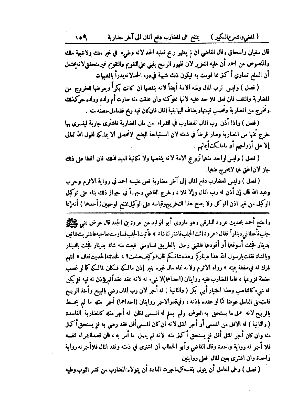 واحتج أحمد بحديث عروة البارقي وهو ما روى أبو الوليد عن عروة بن الجعد قال عرض النبي صلى الله عليه وسلم جلب فأعطاني ديناراً فقال (عروة ائت الجلب فاشتر لنا شاة) فأتيت الجلب فساومت صاحبه فاشتريت شاتين بدينار فجئت أسو قهما أو أقودهما فلقيني رجل بالطريق فساومتي فبعت منه شاة بدينار فجئت بالدينار وبالشاة فقلت يا رسول الله هذا ديناركم وهذه شاتكم قال (وكيف صنعت؟) فحدثته الحديث فقال (اللهم بارك له في صفقة يمينه) رواه الأثرم ولأنه نماء مال غيره بغير إذن مالكه فكان لمالكه كما لو غصب حنطة فزرعها، فأما المضارب ففيه روايتان (إحداهما) لا شئ له لأنه عقد عقداً لم يؤذن له فيه فلم يكن له شئ كالغاصب وهذا اختيار أبي بكر (والثانية) له أجر لأن رب المال رضي بالبيع وأخذ الربح فاستحق العامل عوضاً كما لو عقده بإذنه، وفي قدر الأجر روايتان (إحداهما) أجر مثله ما لم يحط