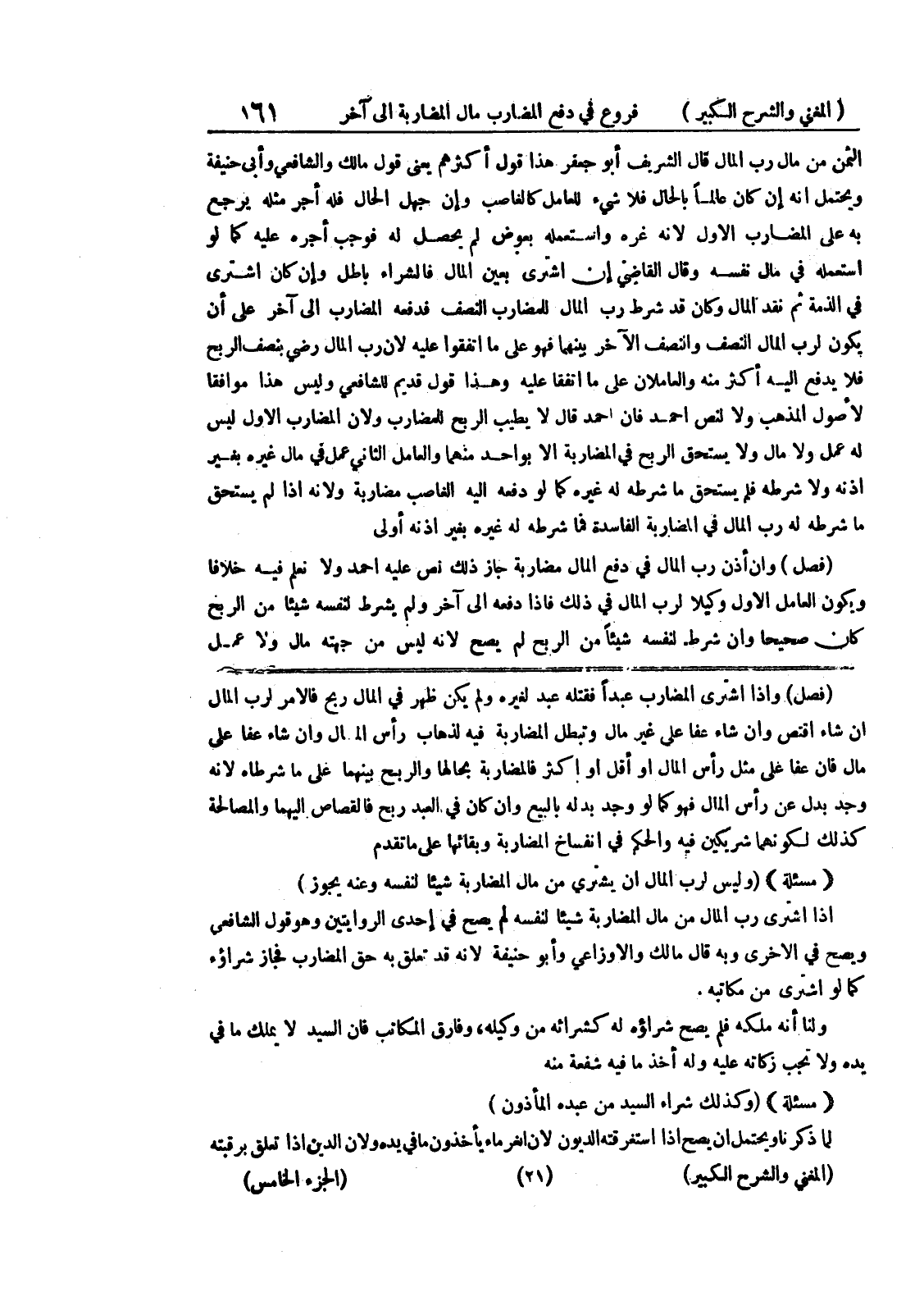 (فصل) وإذا اشترى المضارب عبداً فقتله عبد لغيره ولم يكن ظهر في المال ربح فالأمر لرب المال إن شاء اقتص وإن شاء عفا على غير مال وتبطل المضاربة فيه لذ هاب رأس المال وإن شاء عفا على مال فإن عفا على مثل رأس المال أو أقل أو أكثر فالمضاربة بحالها والربح بينهما على ما شرطاه لأنه وجد بدل عن رأس المال فهو كما لو وجد بدله بالبيع وإن كان في العبد ربح فالقصاص اليهما والمصالحة كذلك لكونهما شريكين فيه والحكم في انفساخ المضاربة وبقائها على ما تقدم (مسألة) (وليس لرب المال أن يشتري من مال المضاربة شيئاً لنفسه وعنه يجوز) إذا اشترى رب المال من مال المضاربة شيئاً لنفسه لم يصح في إحدى الروايتين وهو قول الشافعي ويصح في الأخرى وبه قال مالك والاوزاعي وأبو حنيفة لأنه قد تعلق به حق المضارب فجاز شراؤء كما لو اشترى من مكاتبه.