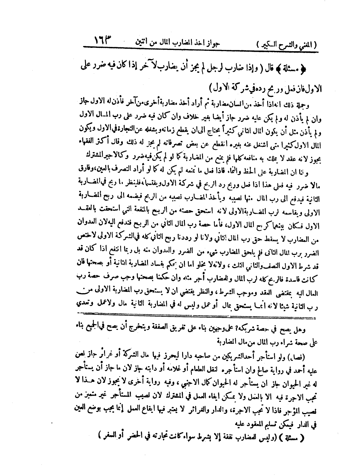 وهل يصح في حصة شريكه؟ على وجهين بناء على تفريق الصفقة ويتخرج أن يصح في الجميع بناء على صحة شراء رب المال من مال المضاربة (فصل) ولو استأجر أحد الشريكين من صاحبه داراً ليحرز فيها مال الشركة أو غرائر جاز نص عليه أحمد في رواية صالح وإن استأجره لنقل الطعام أو غلامه أو دابته جاز لأن ما جاز أن يستأجر له غير الحيوان جاز أن يستأجر له الحيوان كمال الأجنبي، وفيه رواية أخرى لا يجوز لأن هذا لا تجب الأجرة فيه إلا بالعمل ولا يمكن إيفاء العمل في المشترك لأن نصيب المستأجر غير متميز من نصيب المؤجر فإذا لا تجب الأجرة، والدار والغرائر لا يعتبر فيها إيقاع العمل إنما يجب بوضع العين في الدار فيمكن تسليم المعقود عليه (مسألة) (وليس للمضارب نفقة إلا بشرط سواء كانت تجارته في الحضر أو السفر)