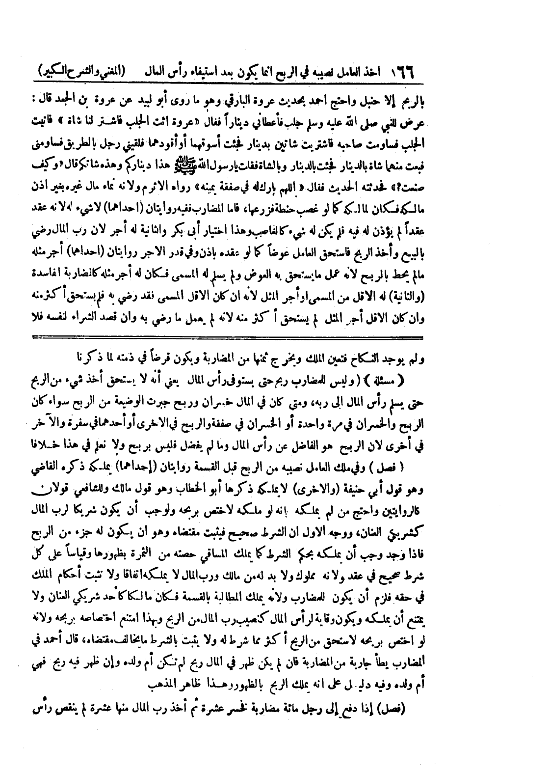 حتى يسلم رأس المال الى ربه، ومتى كان في المال خسارن وربح جبرت الوضيعة من الربح سواء كان الربح والخسران في مرة واحدة أو الخسران في صفقة والربح في الأخرى أو أحد هما في سفرة والآخر في أخرى لأن الربح هو الفاضل عن رأس المال وما لم يفضل فليس بربح ولام نعلم في هذا خلافا (فصل) وفي ملك العامل نصيبه من الربح قبل القسمة روايتان (إحداهما) يملكه ذكره القاضي وهو قول أبي حنيفة (والأخرى) لا يملكه ذكرها أبو الخطاب وهو قول مالك وللشافعي قولان كالروايتين واحتج من لم يملكه أنه لو ملكه لاختص بربحه ولو جب أن يكون شريكا لرب المال كشريكي العنان، ووجه الأول أن الشرط صحيح فيثبت مقتضاه وهو أن يكون له جزء من الربح فإذا وجد وجب أن يملكه بحكم الشرط كما يملك المساقي حصته من الثمرة بظهورها وقياساً على كل شرط صحيح في عقد ولأنه مملوك ولا بد له من مالك ورب المال لا يملكه اتفاقا ولا تثبت أحكام الملك في حقه فلزم أن يكون للمضارب ولأنه يملك المطالبة بالقسمة فكان مالكا كأحد شريكي العنان ولا يمتنع أن يملكه ويكون وقاية لرأس المال كنصيب رب المال من الربح وبهذا امتنع اختصاصه بربحه ولأنه لو اختص بربحه لا ستحق من الربح أكثر مما شرط له ولا يثبت بالشرط ما يخالف مقتضاه، قال أحمد في المضارب يطأ جارية من المضاربة فإن لم يكن ظهر في المال ربح لم تكن أم ولده وإن ظهر فيه ربح فهي أم ولده وفيه دليل على أنه يملك الربح بالظهور وهذا ظاهر المذهب (فصل) إذا دفع إلى رجل مائة مضاربة فخسر عشرة ثم أخذ رب المال منها عشرة لم ينقص رأس