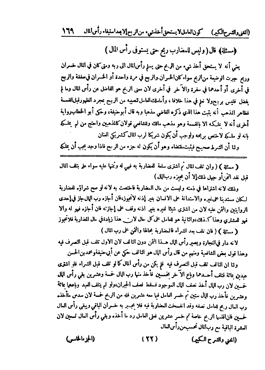 (مسألة) (وإن تلف المال ثم اشترى سلعة للمضاربة به فهي له وثمنها عليه سواء علم بتلف المال قبل نقد الثمن أو جهل ذلك إلا أن يجبزه رب المال) وذلك لأنه اشتراها في ذمته وليست من مال المضاربة فاختصت به لأنه لو صح شراؤه للمضاربة لكان مستديناً على غيره والإستدانة على الإنسان بغير إذنه لا تجوز، فإن إجازة رب المال جاز في إحدى الروايتين والثمن عليه لأن من اشترى شيئاً لغيره بغير إذنه وقف على إجازته فإن أجازه فهو له وإلا فهو للمشتري وهذا كذلك، والثانية هو للعامل على كل حال لأن هذا زيادة في مال المضاربة فلا تجوز (مسألة) (فإن تلف بعد الشراء فالمضاربة بحالها والثمن على رب المال) لانه دار في التجارة ويصير رأس المال هذا الثمن دون التالف لأن الأول تلف قبل التصرف فيه وهذا قول بعض الشافعية ومنهم من قال رأس المال هو التالف حكي عن أبي حنيفة ومحمد بن الحسن ولنا أن التالف تلف قبل التصرف فيه فلم يكن من رأس المال كما لو تلف قبل الشراء فلو اشترى عبدين بمائة فتلف أحدهما وباع الآخر بخمسين فأخذ منها رب المال خمسه وعشرين بقي رأس المال خمسين لأن رب المال أخذ نصف المال الموجود فسقط نصف الجبران، ولو لم يتلف العبد وباعهما بمائة وعشرين فأخذ رب المال ستين ثم خسر العامل فيما معه عشرين فله من الربح خمسة لأن سدس ما أخذه رب المال ربح للعامل نصفه وقد انفسخت المضاربة فيه فلا يجبر به خسران الباقي ويبقى رأس المال