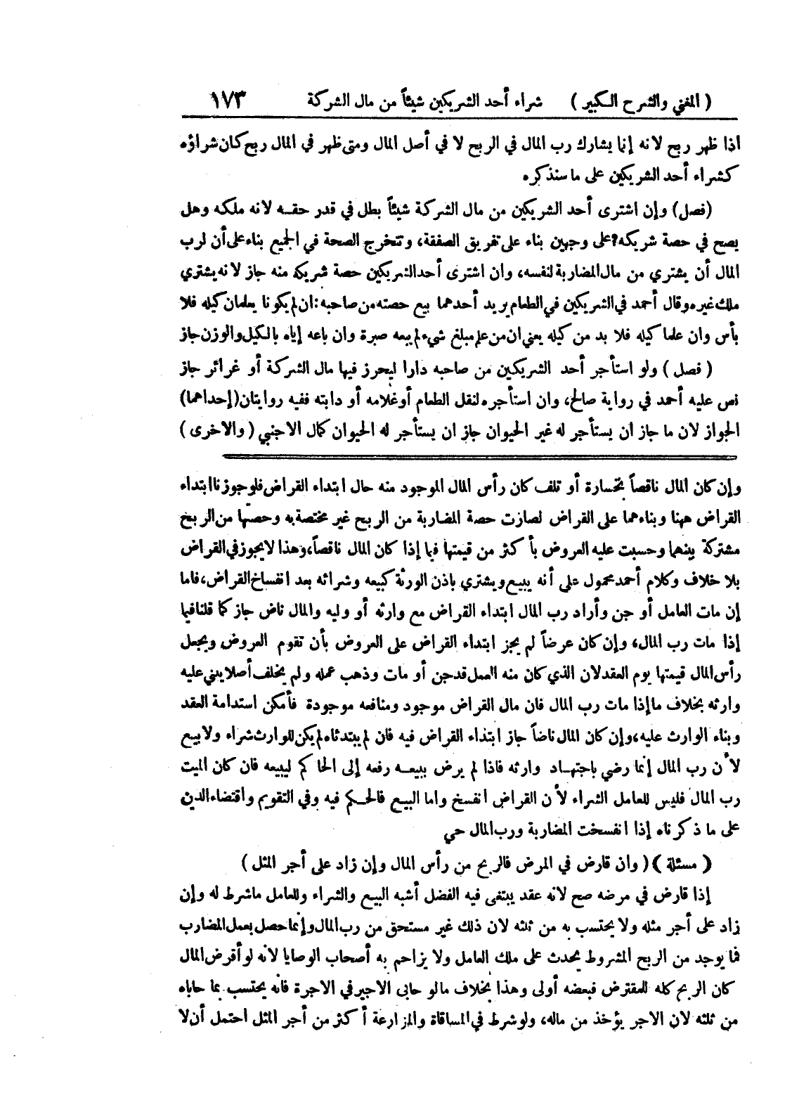 وارثه بخلاف ما إذا مات رب المال فأن مال القراض موجود ومنافعه موجودة فأمكن استدامة العقد وبناء الوارث عليه، وإن كان المال ناضاً جاز ابتداء القراض فيه فإن لم يبتدئاه لم يكن للوارث شراء ولا يبع لأن رب المال إنما رضي باجتهاد وارثه فإذا لم يرض ببيعه رفعه إلى الحاكم ليبيعه فإن كان الميت رب المال فليس للعامل الشراء لأن القراض انفسخ وأما البيع فالحكم فيه وفي التقويم واقتضاء الدين على ما ذكرناه إذا انفسخت المضاربة ورب االمال حي (مسألة) (وإن قارض في المرض فالربح من رأس المال وإن زاد على أجر المثل) إذا قارض في مرضه صح لأنه عقد يبتغي فيه الفضل أشبه البيع والشراء وللعامل ما شرط له وإن زاد على أجر مثله ولا يحتسب به من ثلثه لأن ذلك غير مستحق من رب المال وإنما حصل بعمل المضارب فما يوجد من الربح المشروط يحدث على ملك العامل ولا يزاحم به أصحاب الوصايا لأنه لو أقرض المال كان الربح كله للمقترض فبعضه أولى وهذا بخلاف ما لو حابى الأجير في الأجرة فإنه يحتسب بما حاباه من ثلثه لأن الأجر يؤخذ من ماله، ولو شرط في المساقاة والمزارعة أكثر من أجر المثل احتمل أن لا