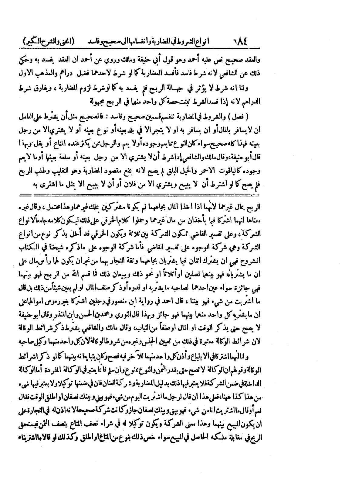الربح بمال غير هما لأنهما إذا أخذا المال بجاههما لم يونا مشتركين بملك غيرهما وهذا محتمل، وقال غيره معناها انعما اشتركا فيما يأخذان من مال غيرهما وحملوا كلام الخرقي على ذلك ليكون كلامه جامعاً لأنواع الشركة، وعلى تفسير القاضي تكون الشركة بين ثلاثة ويكون الخرقي قد أخل بذكر نوع من أنواع الشركة، وهي شركة الوجوه على تفسير القاضي فأما شركة الوجوه على ما ذكره شيخنا في الكتاب المشروح فهي أن يشترك اثنان فيما يشتريان بجاههما وثقة التجاربهما من غيران يكون لهما رأس مال على أن ما يشتريانه فهو بينهما نصفين أو أثلاثاً أو نحو ذلك ويبيعان ذلك فما قسم الله من الربح فهو بينهما فهي جائزة سواء عين أحدهما لصاحبه ما يشتريه أو قدره أو ذكر صنف المال أو لم يعين شيئاً من ذلك بل قال ما اشتريت من شئ فهو بيننا، قال أحمد في رواية ابن منصور في رجلين اشتركا بغير رءوس أموالهما على أن ما يشتريه كل واحد منهما بينهما فهو جائز وبهذا قال الثوري ومحمد بن الحسن وابن المنذر وقال أبو حنيفة لا يصح حتى يذكر الوقت أو المال أو صنفاً من الثياب، وقال مالك والشافعي يشترط ذكر شرائط الوكالة لأن شرائط الوكالة معتبرة في ذلك من تعيين الجنس وغيره من شروط الوكالة لأن كل واحد منهما وكيل صاحبه ولنا أنهما اشتركا في الابتياع وأذن كل واحد منهما للآخر فيه فصح وكان يتبايعانه بينهما كما لو ذكرا شرائط الوكالة وقولهم أن الوكالة لا تصح حتى يقدر الثمن والنوع ممنوع وإن سلم فإنما يعتبر في الوكالة المفردة أما الوكالة
