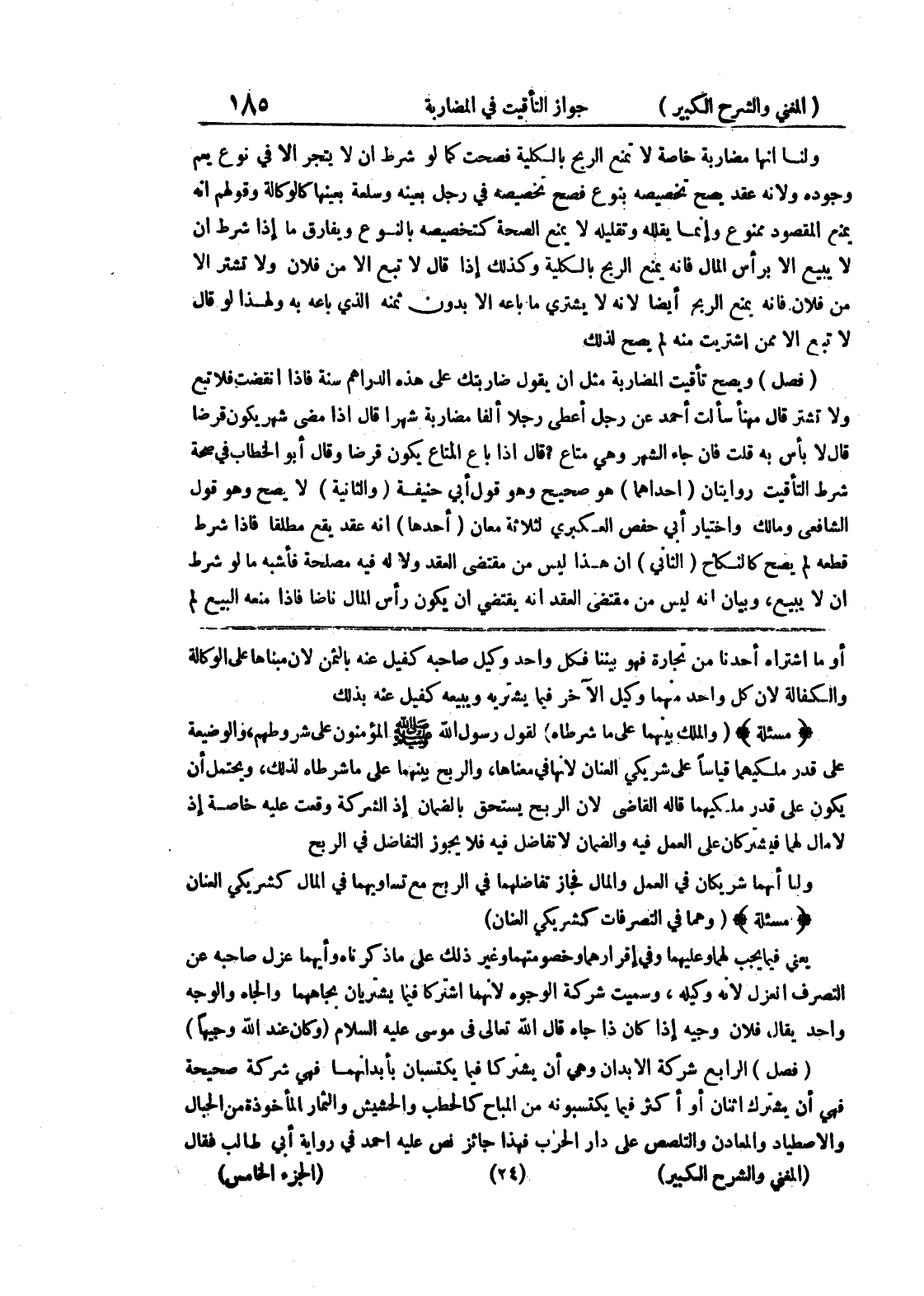 أو ما اشتراه أحدنا من تجارة فهو بيننا فكل واحد وكيل صاحبه كفيل عنه بالثمن لأن مبناها على الوكالة والكفالة لأن كل واحد منهما وكيل الآخر فيما يشتريه ويبيعه كفيل عنه بذلك (مسألة) (والملك بينهما على ما شرطاه) لقول رسول الله صلى الله عليه وسلم المؤمنون على شروطهم، والوضيعة على قدر ملكيهما قياساً على شريكي العنان لأنها في معناها، والربح بينهما على ما شرطاه لذلك، ويحتمل أن يكون على قدر ملكيهما قاله القاضي لأن الربح يستحق بالضمان إذ الشركة وقعت عليه خاصة إذ لا مال لهما فيشتركان على العمل فيه والضمان لا تفاضل فيه فلا يجوز التفاضل في الربح ولانها شريكان في العمل والمال فجاز تفاضلهما في الربح مع تساو يهما في المال كشريكي العنان (مسألة) (وهما في التصرفات كشريكي العنان) يعني فيما يجب لهما وعليهما وفي إقراهما وخصومتهما وغير ذلك على ما ذكرناه وأيهما عزل صاحبه عن التصرف انعزل لأنه وكيله، وسميت شركة الوجوه لأنهما اشتركا فيما يشتريان بجاهما والجاه والوجه واحد يقال فلان وجيه إذا كان ذا جاه قال الله تعالى في موسى عليه السلام (وكان عند الله وجيها) (فصل) الرابع شركة الأبدان وهي أن يشتركا فيما يكتسبان بأبدانهما فهي شركة صحيحة فهي أن يشترك اثنان أو أكثر فيما يكتسبونه من المباح كالحطب والحشيش والثمار المأخوذة من الحبال والاصطياد والمعادن والتلصص على دار الحرب فهذا جائز نص عليه أحمد في رواية أبي طالب فقال