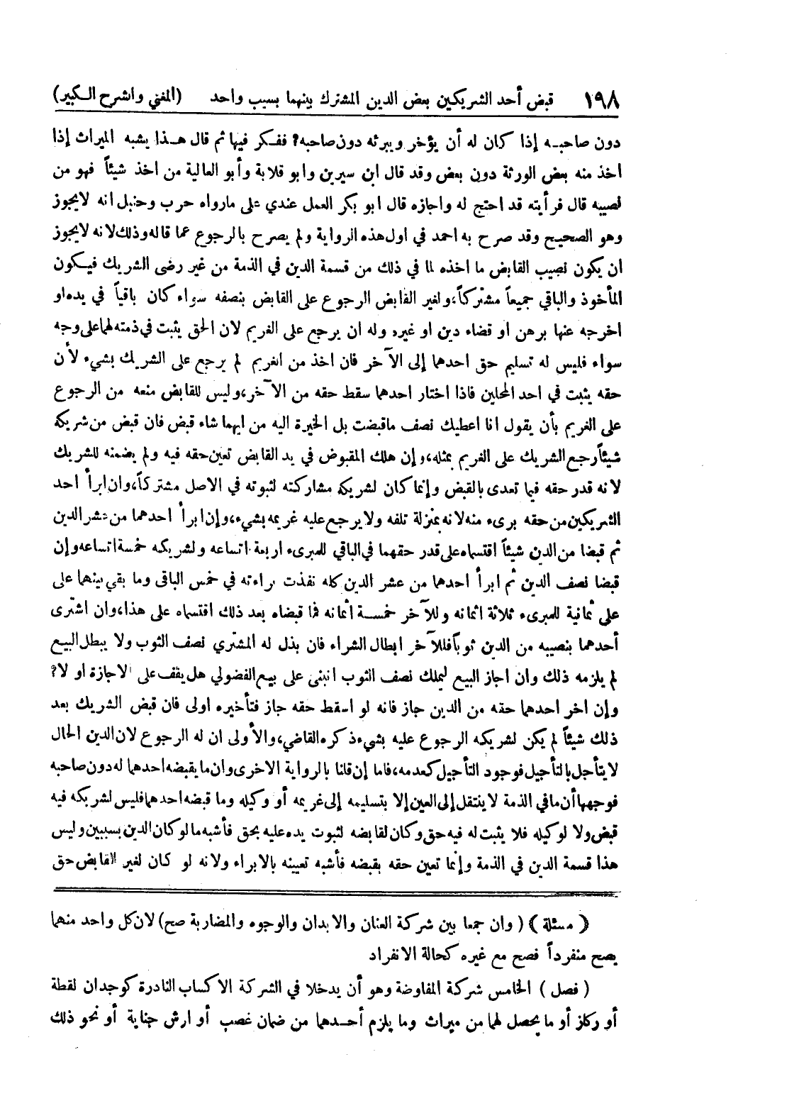 يصح منفرداً فصح مع غيره كحالة الإنفراد (فصل) الخامس شركة المفاوضة وهو أن يدخلا في الشركة الأكساب النادرة كوجدان لقطة أو ركاز أو ما يحصل لهما من ميراث وما يلزم أحدهما من ضمان غصب أو أرش جناية أو نحو ذلك
