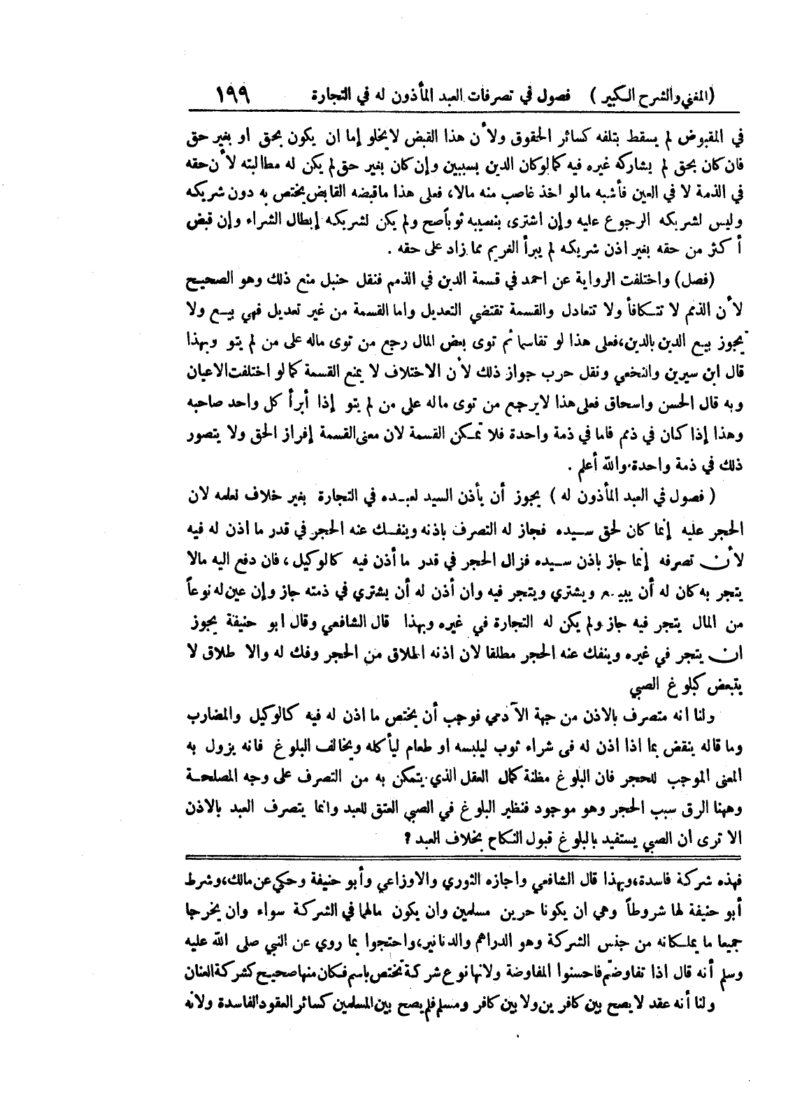 فهذه شركة فاسدة، وبهذا قال الشافعي واجازه الثوري والاوزاعي وأبو حنيفة وحكي عن مالك وشرط أبو حنيفة لها شروطاً وهي أن يكونا حرين مسلمين وإن يكون مالهما في الشركة سواء وإن يخرجا جميعاً ما يملكانه من جنس الشركة وهو الدراهم والدنانير، واحتجوا بما روي عن النبي صلى الله عليه وسلم أنه قال إذا تفاوضتم فأحسنوا المفاوضة ولأنها نوع شركة تختص باسم فكان منها صحيح كشركة العنان ولنا أنه عقد لا يصح بين كافرين ولابين كافر ومسلم فلم يصح بين المسلمين كسائر العقود الفاسدة ولأنه