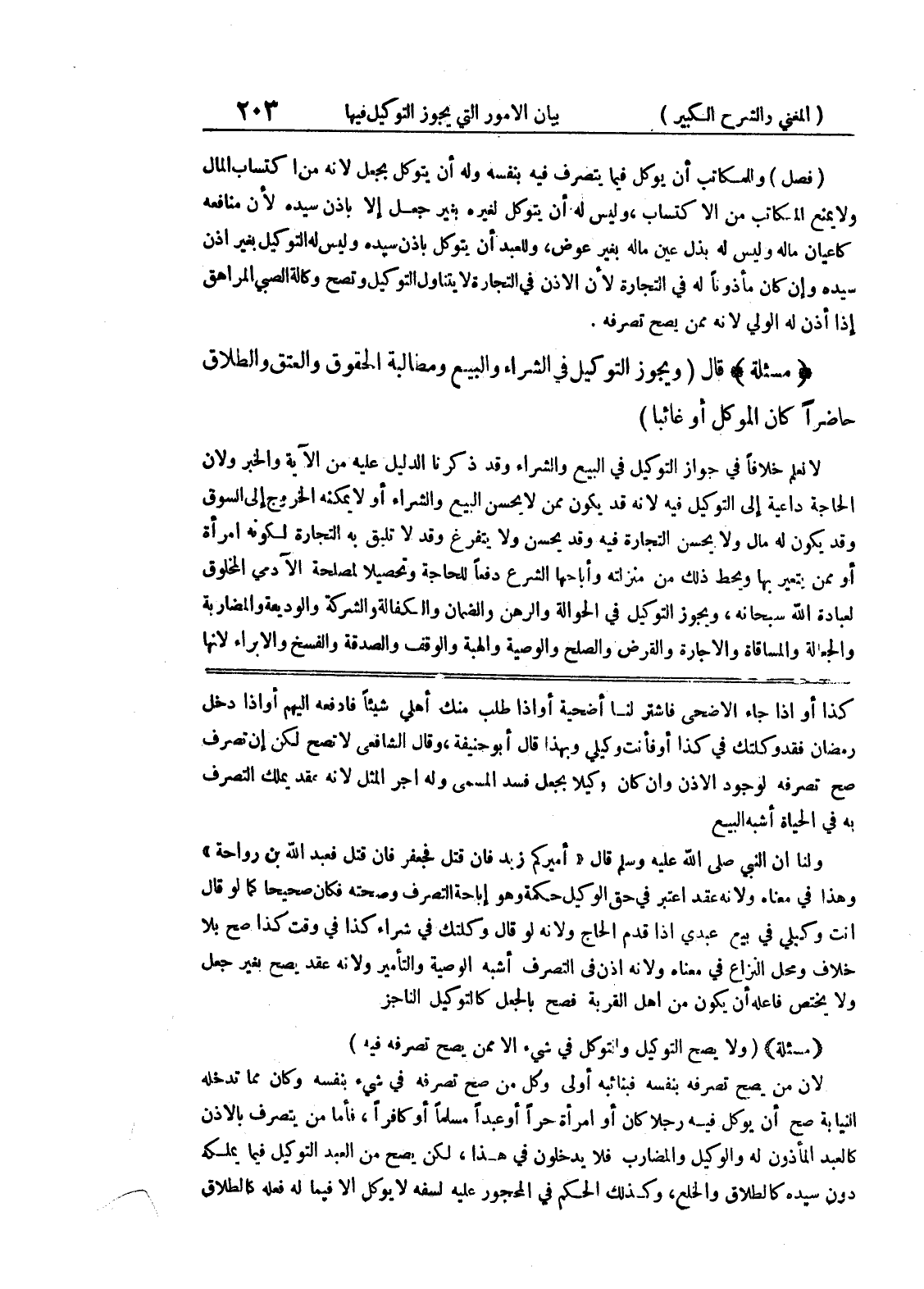 كذا او إذا جاء الأضحى فاشتر لنا أضحية أو إذا طلب منك أهلي شيئاً فادفعه إليهم أو إذا دخل رمضان فقد وكلتك في كذا أو فأنت وكيلي وبهذا قال أبو حنيفة، وقال الشافعي لا تصح لكن إن تصرف صح تصرفه لوجود الإذن وإن كان وكيلا بجعل فسد المسمى وله أجر المثل لأنه عقد يملك التصرف به في الحياة أشبه البيع ولنا أن النبي صلى الله عليه وسلم قال (أمير كم زيد فإن قتل فجعفر فإن قتل فعبد الله بن رواحة) وهذا في معناه ولا نه عقد اعتبر في حق الوكيل حكمة وهو إباحة التصرف وصحته فكان صحيحاً كما لو قال أنت وكيلي في بيع عبدي إذا قدم الحاج ولأنه لو قال وكلتك في شراء كذا في وقت كذا صح بلا خلاف ومحل النزاع في معناه ولأنه أذن في التصرف أشبه الوصية والتأمير ولأنه عقد يصح بغير جعل ولا يختص فاعله أن يكون من أهل القربة فصح بالجعل كالتوكيل الناجز (مسألة) (ولا يصح التوكيل والتوكل في شئ الاممن يصح تصرفه فيه) لأن من يصح تصرفه بنفسه فبنائبه أولى وكل من صح تصرفه في شئ بنفسه وكان مما تدخله النيابة صح أن يوكل فيه رجلا كان أو امرأة حرا أو عبدا مسلماً أو كافراً فأما من يتصرف بالإذن كالعبد المأذون له والوكيل والمضارب فلا يدخلون في هذا، لكن يصح من العبد التوكيل فيما يملكه دون سيده كالطلاق والخلع، وكذلك الحكم في المحجور عليه لسفه لا يوكل الافيما له فعله كالطلاق