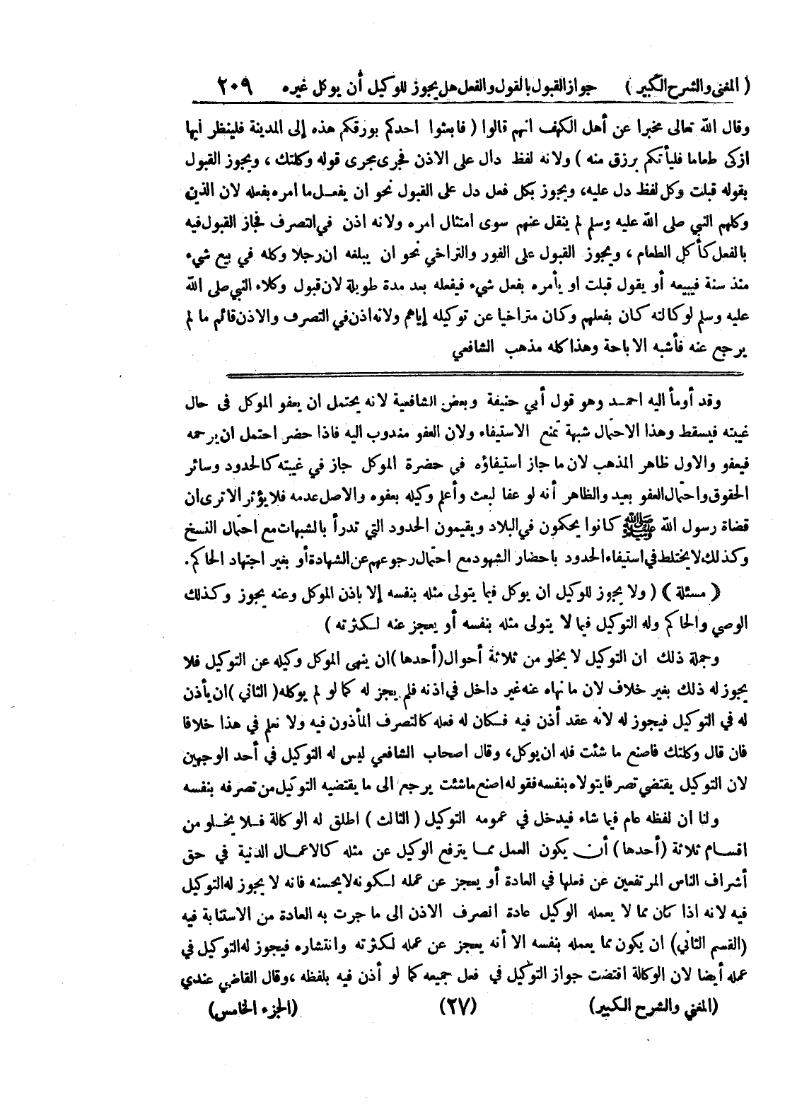 (مسألة) (ولايجوز للوكيل أن يوكل فيما يتولى مثله بنفسه إلا بإذن الموكل وعنه يجوز وكذلك الوصي والحاكم وله التوكيل فيما لا يتولى مثله بنفسه أو يعجز عنه لكثرته) وجملة ذلك أن التوكيل لا يخلو من ثلاثة أحوال (أحدها) أن ينهى الموكل وكيله عن التوكيل فلا يجوز له ذلك بغير خلاف لأن مانهاه عنه غير داخل في إذنه فلم يجزله كما لو لم يوكله (الثاني) أن يأذن له في التوكيل فيجوز له لأنه عقد أذن فيه فكان له فعله كالتصرف المأذون فيه ولا نعلم في هذا خلافاً