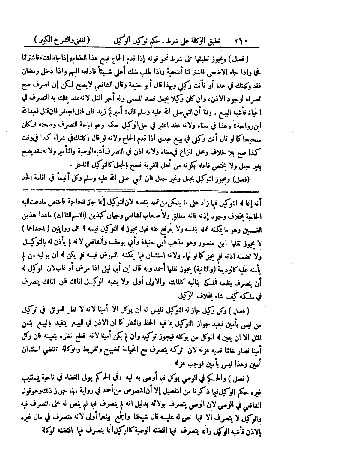 (فصل) والحكم في الوصي يوكل فيما أوصى به إليه وفي الحاكم يولى القضاء في ناحية يستنيب غيره حكم الوكيل فيما ذكرنا من التفصيل إلا أن المنصوص عن أحمد في رواية منها جواز ذلك وهو قول الشافعي في الوصي لأن الوصي يتصرف بولائه بدليل أنه لم يتصرف فيما لم ينص له على التصرف فيه والوكيل لا يتصرف إلا فيما نص له عليه قال شيخنا والجمع بينهما أولى لأنه متصرف في مال غيره بالإذن فأشبه الوكيل وإنما يتصرف فيما اقتضته الوصية كالوكيل إنما يتصرف فيما اقتضته الوكالة