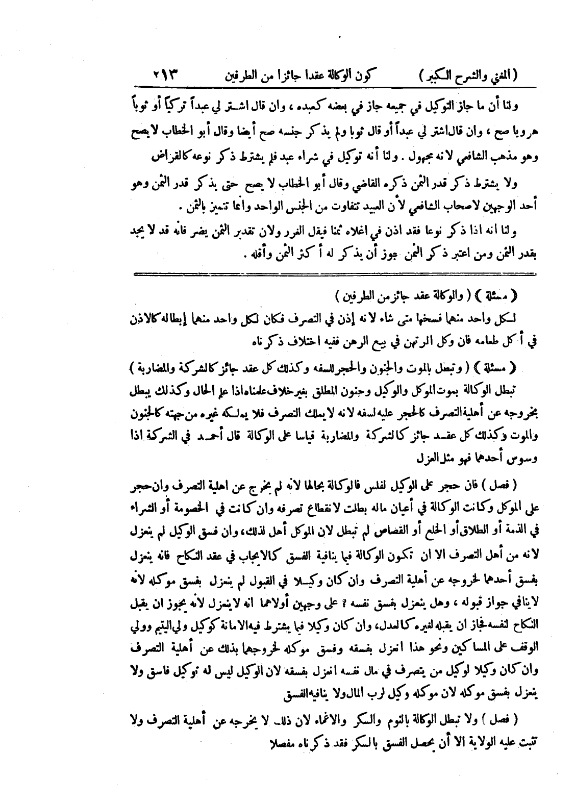 (مسألة) (والوكالة عقد جائز من الطرفين) لكل واحد منهما فسخها متى شاء لأنه أذن في التصرف فكان لكل واحد منهما إبطاله كالإذن في أكل طعامه فإن وكل المرتهن في بيع الرهن ففيه اختلاف ذكرناه (مسألة) (وتبطل بالموت والجنون والحجر للسفه وكذلك كل عقد جائز كالشركة والمضارية) تبطل الوكالة بموت الموكل والوكيل وجنون المطلق بغير خلاف علمناه إذا علم الحال وكذلك يبطل بخروجه عن أهلية التصرف كالحجر عليه لسفه لأنه لا يملك التصرف فلا يملكه غيره من جهته كالجنون والموت وكذلك كل عقد جائز كالشركة والمضاربة قياساً على الوكالة قال أحمد في الشركة إذا وسوس أحدهما فهو مثل العزل (فصل) فإن حجر على الوكيل لفلس فالوكالة بحالها لأنه لم يخرج عن أهلية التصرف وإن حجر على الموكل وكانت الوكالة في أعيان ماله بطلت لانقطاع تصرفه وإن كانت في الخصومة او الشراء في الذمة أو الطلاق أو الخلع أو القصاص لم تبطل لأن الموكل أهل لذلك، وإن فسق الوكيل لم ينعزل لأنه من أهل التصرف إلا أن تكون الوكالة فيما ينافيه الفسق كالإيجاب في عقد الكاح فإنه ينعزل بفسق أحدهما لخروجه عن أهلية التصرف وإن كان وكيلا في القبول لم ينعزل بفسق موكله لأنه لا ينافي جواز قبوله، وهل يننعزل بفسق نفسه؟ على وجهين أولاهما أنه لا ينعزل لأنه يجوز أن يقبل النكاح لنفسه فجاز أن يقبله لغيره كالعدل، وإن كان وكيلاً فيما يشترط فيه الا مانة كوكيل ولي اليتيم وولي الوقف على المساكين ونحو هذا انعزل بفسقه وفسق موكله لخروجهما بذلك عن أهلية التصرف وإن كان وكيلا لوكيل ومن يتصرف في مال نفسه انعزل بفسقه لأن الوكيل ليس له توكيل فاسق ولا ينعزل بفسق موكله لان موكيله وكيل لرب المال ولا ينافيه الفسق (فصل) ولا تبطل الوكالة بالثوم والسكر والإغماء لأن ذلك لا يخرجه عن أهلية التصرف ولا تثبت عليه الولاية إلا أن يحصل الفسق بالسكر فقد ذكرناه مفصلاً