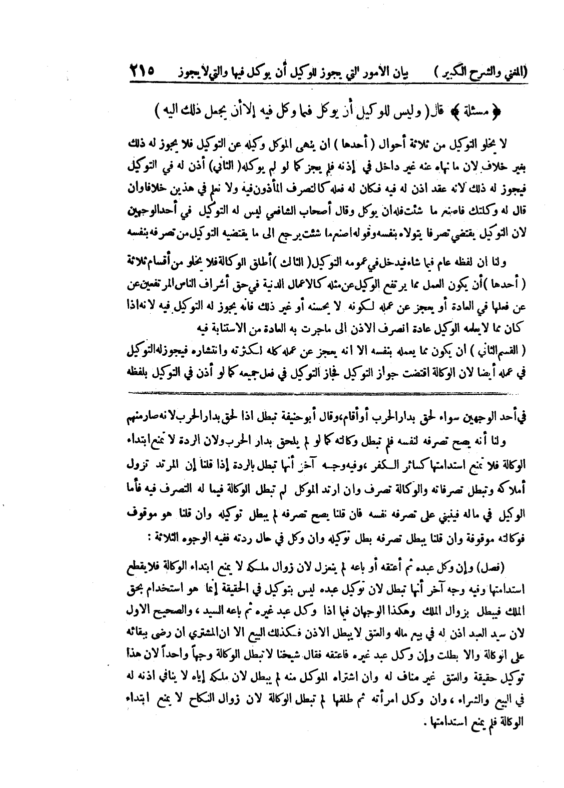 في أحد الوجهين سواء لحق بدار الحرب أو أقام، وقال أبو حنيفة تبطل إذا لحق بدار الحرب لأنه صار منهم ولنا أنه يصح تصرفه لنفسه فلم تبطل وكالته كما لو لم يلحق بدار الحرب ولأن الردة لا تمنع ابتداء الوكالة فلا تمنع استدامتها كسائر الكفر، وفيه وجه آخر أنها تبطل بالردة إذا قلنا إن المرتد تزول أملاكه وتبطل تصرفاته والوكالة تصرف وإن أرتد الموكل لم تبطل الوكالة فيما له التصرف فيه فأما الوكيل في ماله فينبني على تصرفه نفسه فإن قلنا يصح تصرفه لم يبطل توكيله وإن قلنا هو موقوف فوكالته موقوفة وإن قلنا يبطل تصرفه بطل توكيله وإن وكل في حال ردته ففيه الوجوه الثلاثة: (فصل) وإن وكل عبده ثم أعتقه أو باعه لم ينعزل لأن زوال ملكه لا يمنع ابتداء الوكالة فلا يقطع استدامتها وفيه وجه آخر أنها تبطل لأن توكيل عبده ليس بتوكيل في الحقيقة إنما هو استخدام بحق الملك فيبطل بزوال الملك وهكذا الوجهان فيما إذا وكل عبد غيره ثم باعه السيد، والصحيح الأول