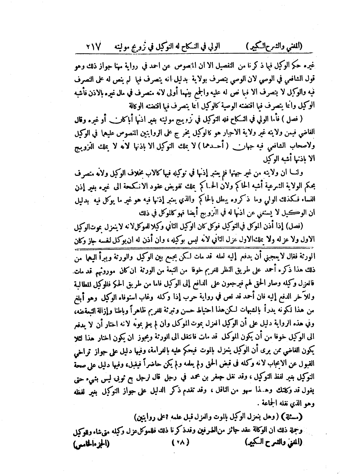 ذلك هذا ذكره أحمد على طريق النظر للغريم خوفاً من التبعة من الورثة أن كان موروثهم قد مات فانعزل وكيله وصار الحق لهم فيرجعون على الدافع الى الوكيل فأما من طريق الحكم فللوكيل المطالبة وللآخر الدفع إليه فإن أحمد قد نص في رواية حرب إذا وكله وغاب استوفاه الوكيل وهو أبلغ من هذا لكونه يدرأ بالشبهات لكن هذا احتياط حسن وتبرئة للغريم ظاهراً وباطناً وإزالة التبعة عنه، وفي هذه الرواية دليل على أن الوكيل انعزل بموت الموكل وإن لم يعلم بموته لأنه اختار أن لا يدفع إلى الوكيل خوفاً من أن يكون الموكل قد مات فانتقل إلى الورثة ويجوز أن يكون اختار هذا لئلا يكون القاضي ممن يرى أن الوكيل ينعزل بالموت فيحكم عليه بالغرامة، وفيها دليل على جواز تراخى القبول عن الإيجاب لأنه وكله في قبض الحق ولم يعلمه ولم يكن حاضراً فيقبل، وفيها دليل على صحة التوكيل بغير لفظ التوكيل، وقد نقل جعفر بن محمد في رجل قال لرجل بع ثوبي ليس بشئ حتى يقول قد وكلتك وهذا سهو من الناقل، وقد تقدم ذكر الدليل على جواز التوكيل بغير لفظه وهو الذي نقله الجماعة.