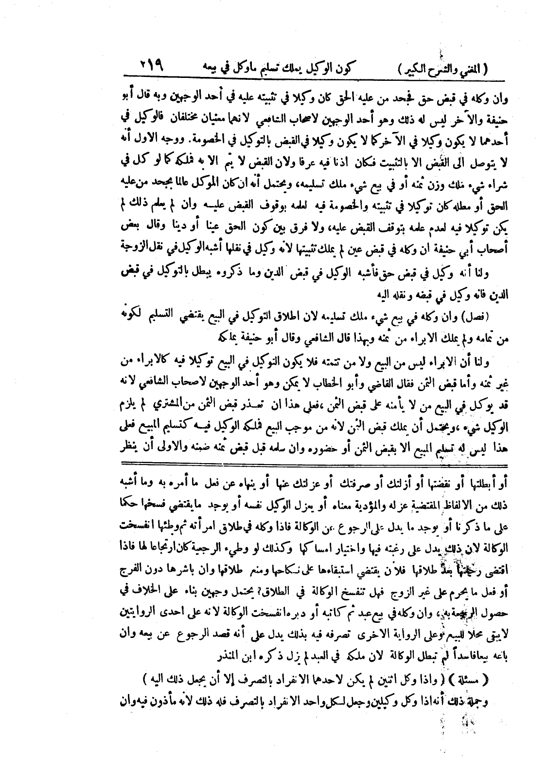 أو أبطلتها أو نقضتها أو أزلتك أو صرفتك أو عزلتك عنها أو ينهاه عن فعل ما أمره به وما أشبه ذلك من الألفاظ المقتضية عزله والمؤدية معناه أو يعزل الوكيل نفسه أو يوجد ما يقتضي فسخها حكما على ما ذكرنا أو يوجد ما يدل على الرجوع عن الوكالة فإذا وكله في طلاق امرأته ثم وطئها انفسخت الوكالة لأن ذلك يدل على رغبته فيها واختيار إمساكها وكذلك لو وطئ الرجعية كان ارتجاعا لها فإذا اقتضى رجعتها بعد طلاقها فلان يقتضي استيقاءها على نكاحها ومنع طلاقها وإن باشرها دون الفرج أو فعل ما يحرم على غير الزوج فهل تنفسخ الوكالة في الطلاق؟ يحتمل وجهين بناء على الخلاف في حصول الرجعة به، وإن وكله في بيع عبد ثم كاتبه أو دبرها نفسخت الوكالة لأنه على إحدى الروايتين لا يبقى محلا للبيع وعلى الرواية الأخرى تصرفه فيه بذلك يدل على أنه قصد الرجوع عن بيعه وإن باعه بيعاً فاسداً لم تبطل الوكالة لأن ملكه في العبد لم يزل ذكره ابن المنذر (مسألة) (وإذا وكل اثنين لم يكن لأحدهما الانفراد بالتصرف إلا أن يجعل ذلك إليه) وجملة ذلك أنه إذا وكل وكيلين وجعل لكل واحد الإنفراد بالتصرف فله ذلك لأنه مأذون فيه وإن
