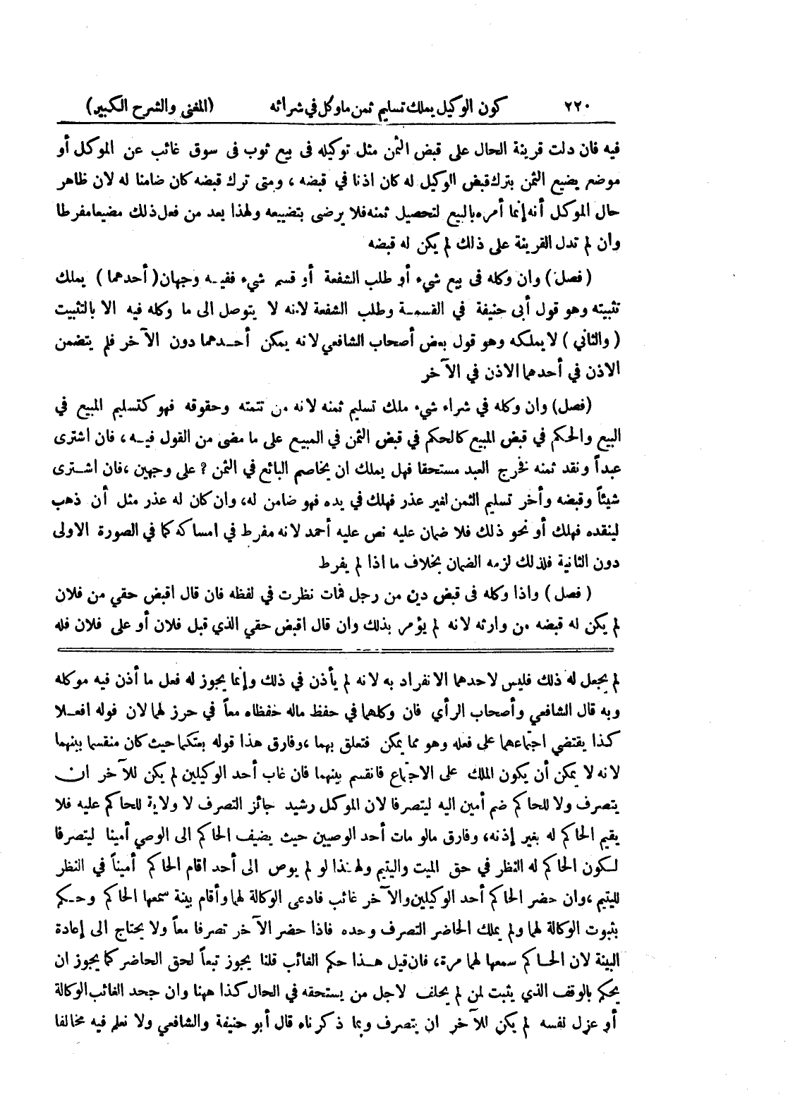 لم يجعل له ذلك فليس لأحدهما الانفراد به لأنه لم يأذن في ذلك وإنما يجوز له فعل ما أذن فيه موكله وبه قال الشافعي وأصحاب الرأي فإن وكلهما في حفظ ماله حفظاه معاً في حرز لهما لان فوله افعلا كذا يقتضي اجتماعهما على فعله وهو مما يمكن تعلق بهما، وفارق هذا قوله بعتكما حيث كان منقسما ببنهما لأنه لا يمكن أن يكون الملك على الإجتماع فانقسم بينهما فإن غاب أحد الوكيلين لم يكن للآخر أن
