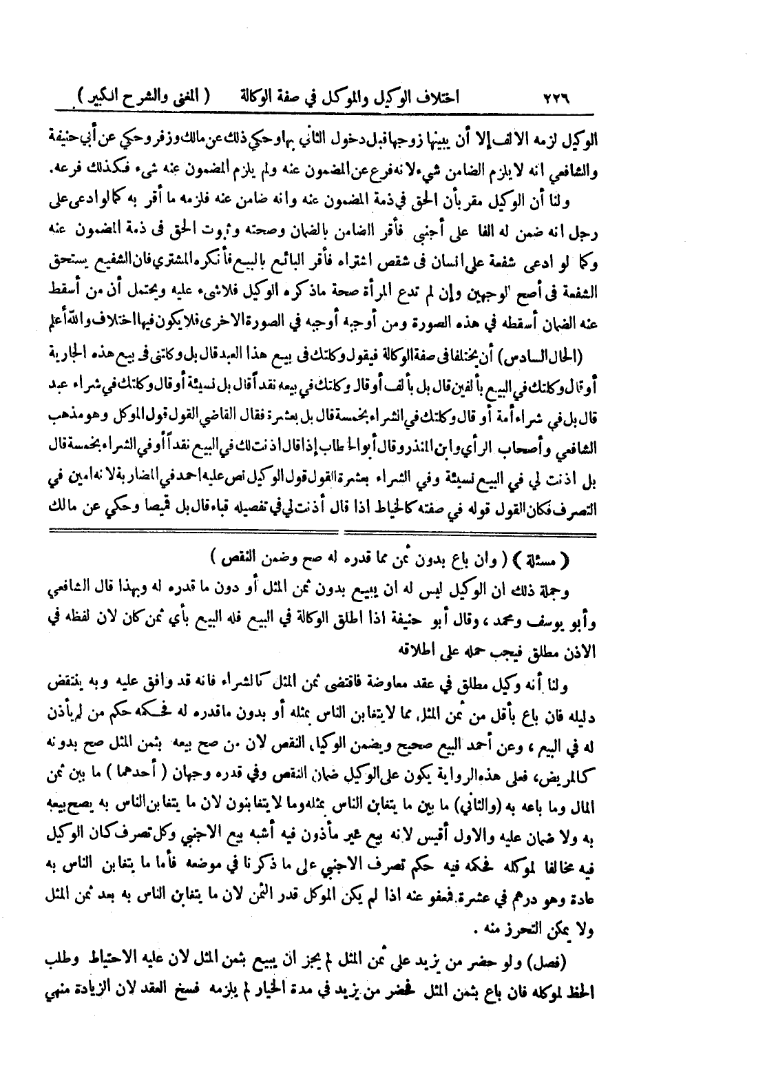(مسألة) (وإن باع بدون ثمن مما قدره له صح وضمن النقص) وجملة ذلك أن الوكيل ليس له أن يبيع بدون ثمن المثل أو دون ما قدره له وبهذا قال الشافعي وأبو يوسف ومحمد قال أبو حنيفة إذا أطلق الوكالة في البيع فله البيع بأي ثمن كان لأن لفظه في الإذن مطلق فيجب حمله على إطلاقه ولنا أنه وكيل مطلق في عقد معاوضة فاقتضى ثمن المثل كالشراء فإنه قد وافق عليه وبه ينتقض دليله فإن باع بأقل من ثمن المثل مما لا يتغابن الناس بمثله أو بدون ما قدره له فحكمه حكم من لم يأذن له في البيع وعن أحمد البيع صحيح ويضمن الوكيل النقص لأن من صح بيعه بثمن المثل صح بدونه كالمريض، فعلى هذه الرواية يكون على الوكيل ضمان النقص وفي قدره وجهان (أحدهما) ما بين ثمن المال وما باع به (والثاني) ما بين ما يتغابن الناس بمثله وما لا يتغابنون لأن ما يتغابن الناس به يصح بيعه به ولا ضمان عليه والأول أقيس لأنه بيع غير مأذون فيه اشبه بيع الأجنبي وكل تصرف كان الوكيل فيه مخالفاً لموكله فحكمه فيه حكم تصرف الأجنبي على ما ذكرنا في موضعه فأما ما يتغابن الناس به عادة وهو درهم في عشرة فمعفو عنه إذا لم يكن الموكل قدر الثمن لأن ما يتغابن الناس به بعد ثمن المثل ولا يمكن التحرز منه.