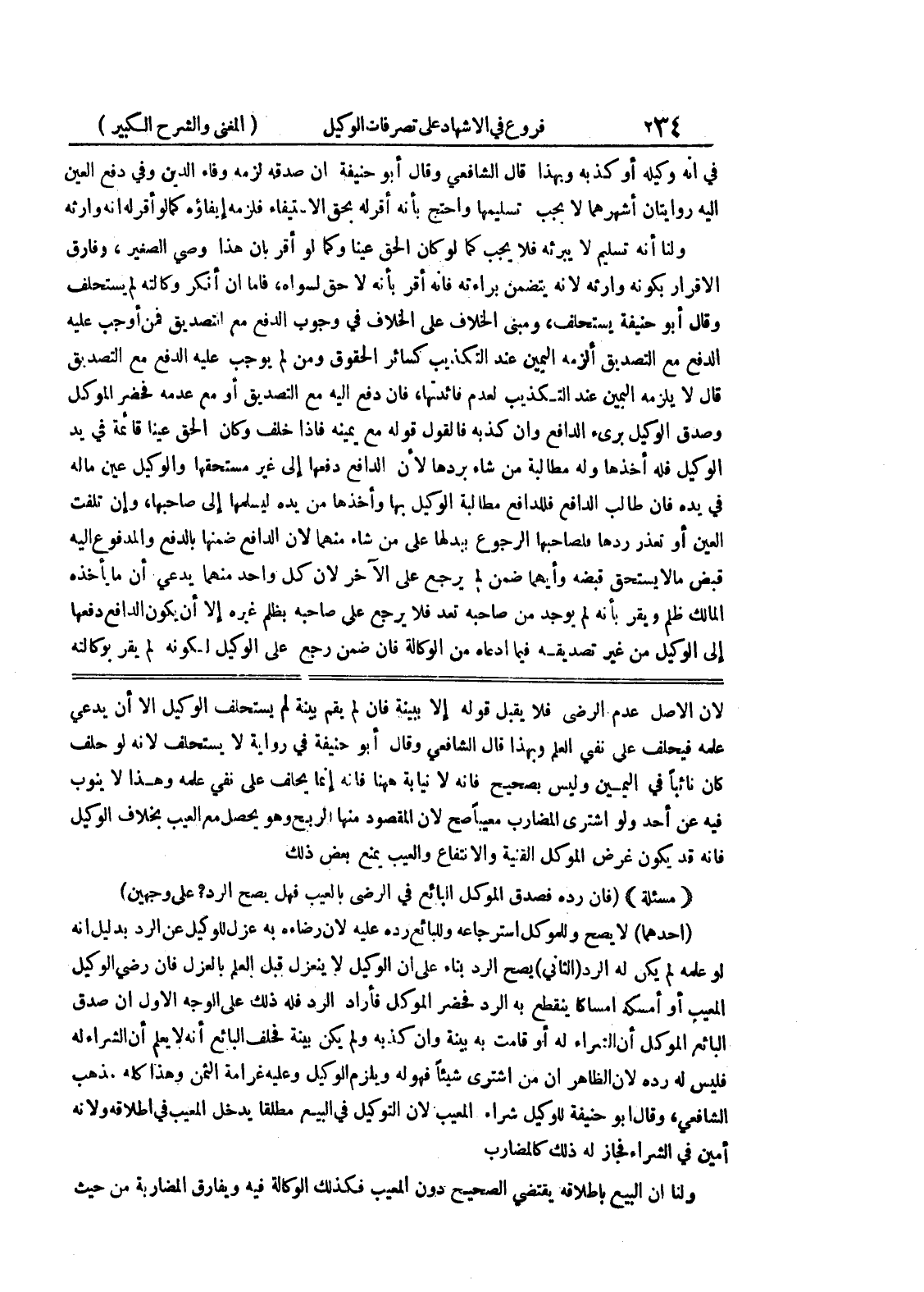 علمه فيحلف على نفي العلم وبهذا قال الشافعي وقال أبو حنيفة في رواية لا يستحلف لأنه لو حلف كان نائباً في اليمين وليس بصحيح فإنه لا نيابة ههنا فإنه إنما يحلف على نفي علمه وهذا لا ينوب فيه عن أحد ولو اشترى المضارب معيباً صح لأن المقصود منها الربح وهو يحصل مع العيب بخلاف الوكيل فإنه قد يكون غرض الموكل القنية والانتفاع والعيب يمنع بعض ذلك (مسألة) (فإن رده فصدق الموكل البائع في الرضى بالعيب فهل يصح الرد؟ على وجهين) (أحدهما) لا يصح وللموكل إسترجاعه وللبائع رده عليه لأن رضاءه به عزل للوكيل عن الرد بدليل أنه لو علمه لم يكن له الرد (الثاني) يصح الرد بناء على أن الوكيل لا ينعزل قبل العلم بالعزل فإن رضي الوكيل المعيب أو أمسكه إمساكاً ينقطع به الرد فحضر الموكل فأراد الرد فله ذلك على الوجه الأول إن صدق البائع الموكل أن الشراء له أو قامت به بينة وإن كذبه ولم يكن بينة فحلف البائع أنه لا يعلم أن الشراء له فليس له رده لأن الظاهر أن منن اشترى شيئاً فهو له ويلزم الوكيل وعليه غرامة الثمن وهذا كله مذهب الشافعي، وقال أبو حنيفة للوكيل شراء المعيب لأن التوكيل في البيع مطلقاً يدخل الميعب في إطلاقه ولأنه أمين في الشراء فجاز له ذلك كالمضارب ولنا أن البيع بإطلاقه يقتضي الصحيح دون المعيب فكذلك الوكالة فيه ويفارق المضاربة من حيث