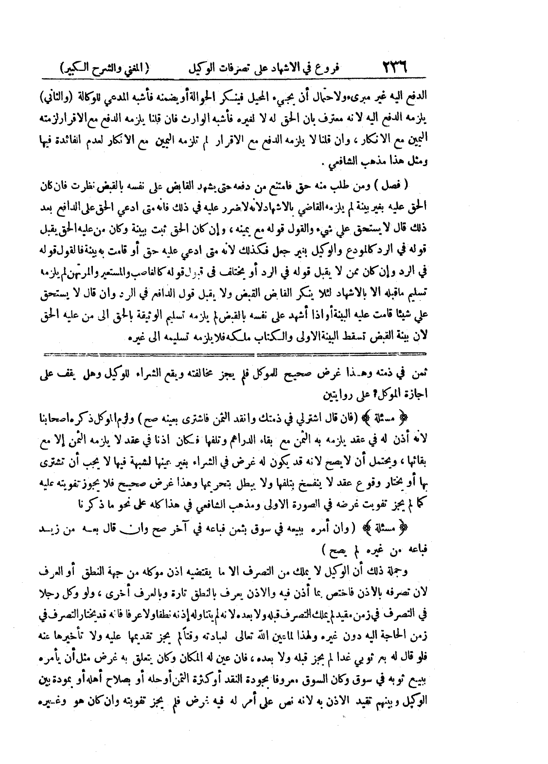 ثمن في ذمته وهذا غرض صحيح للموكل فلم يجز مخالفته ويقع الشراء للوكيل وهل يقف على إجازة الموكل؟ على روايتين (مسألة) (فإن قال اشتر لي في ذمتك وانقد الثمن فاشترى بعينه صح) ولزم الموكل ذكره أصحابنا لأنه أذن له في عقد يلزمه به الثمن مع بقاء الدراهم وتلفها فكان إذنا في عقد لا يلزمه الثمن إلا مع بقائها، ويحتمل أن لا يصح لأنه قد يكون له غرض في الشراء بغير عينها لشبهة فيها لا يجب أن تشتري بها أو يختار وقوع عقد لا ينفسخ بتلفها ولا يبطل بتحريهما وهذا غرض صحيح فلا يجوز تفويته عليه كما لم يجز تفويت غرضه في الصورة الأولى ومذهب الشافعي في هذا كله على نحو ما ذكرنا (مسالة) (وإن أمره ببيعه في سوق بثمن فباعه في آخر صح وإن قال بعه من زيد فباعه من غيره لم يصح) وجملة ذلك أن الوكيل لا يملك من التصرف الاما يقتضيه إذن موكله من جهة النطق أو العرف لأن تصرفه بالإذن فاختص بما أذن فيه والإذن يعرف بالنطق تارة وبالعرف أخرى، ولو وكل رجلا في التصرف في زمن مقيد لم يملك التصرف قبله ولا بعده لأنه لم يتناوله إذنه نطقا ولاعرفا فإنه قد يختار التصرف في زمن الحاجة إليه دون غيره ولهذا لما عين الله تعالى لعبادته وقتاً لم يجز تقديمها عليه ولا تأخيرها عنه فلو قال له بع ثوبي غدا لم يجز قبله ولا بعده، فإن عين له المكان وكان يتعلق به غرض مثل أن يأمره
