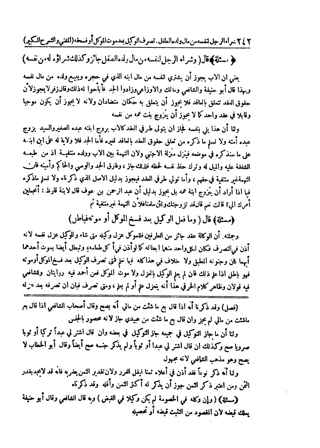 (فصل) وقد ذكرنا أنه إذا قال بع ما شئت من مالي أنه يصح وقال أصحاب الشافعي إذا قال بع ما شئت من مالي لم يجز وإن قال بع ما شئت من عبيدي جاز لأنه محصور بالجنس ولنا أن ما جاز التوكيل في جميعه جاز التوكيل في بعضه وإن قال اشتر لي عبداً تركياً أو ثوباً صروياً صح وكذلك إن قال إشتر لي عبداً أو ثوباً ولم يذكر جنسه صح أيضاً وقال أبو الخطاب لا يصح وهو مذهب الشافعي لأنه مجهول ولنا أنه ذكر نوعاً فقد أذن في أعلاه ثمناً فيقل الغرر ولأن تقدير الثمن يضربه فإنه قد لا يجد بقدر الثمن ومن اعتبر ذكر الثمن جوز أن يذكر له أكثر الثمن وأقله وقد ذكرناه (مسألة) (وإن وكله في الخصومة لم يكن وكيلاً في القبض) وبه قال الشافعي وقال أبو حنيفة يملك قبضه لأن المقصود من التثبت قبضه أو تحصيله