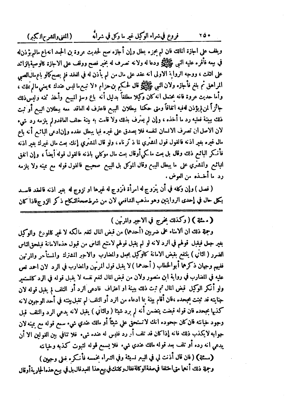 بغير جعل فيقبل قولهم في الرد لأنه لو لم يقبل قولهم لامتنع الناس من قبول هذه الأمانة فيلحق الناس الضرر (الثاني) ينتفع بقبض الأمانة كالوكيل بجعل والمضارب والأجير المشترك والمستأحر والمرتهن ففيهم وجهان ذكرهما أبو الخطاب (أحدهما) لا يقبل قول المرتهن والمضارب في الرد لأن أحمد نص عليه في المضارب في رواية ابن منصور ولأن من قبض المال لنفع نفسه لا يقبل قوله في الرد كالمستعير ولو أنكر الوكيل قبض المال ثم ثبت ذلك ببينة أو اعتراف فادعى الرد أو التلف لم يقبل قوله لأن جنايته قد ثبتت بجحده، فإن أقام بينة بما ادعاه من الرد أو التلف لم تقبل بينته في أحد الوجهين لأنه كذبها بجحده فإن قوله قبضت يتضمن أنه لم يرد شيئاً (والثاني) يقبل لأنه يدعي الرد والتلف قبل وجود خيانته فإن كان جحوده إنك لا تستحق علي شيئاً أو مالك عندي شئ سمع قوله مع يمينه لأن جوابه لا يكذب ذلك فإنه إذا كان قد تلف أو رد فليس له عنده شئ فلا تنافي بين القولين إلا أن يدعي أنه رده أو تلف بعد قوله مالك عندي شئ فلا يسمع قوله لثبوت كذبه وخيانته (مسألة) (فإن قال أذنت لي في البيع نسيئة وفي الشراء بخمسة فأنكره فعلى وجهين) وجملة ذلك أنهما متى اختلفا في صفة الوكالة فقال وكلتك في بيع هذا العبد قال بل في بيع هذه الجارية أو قال