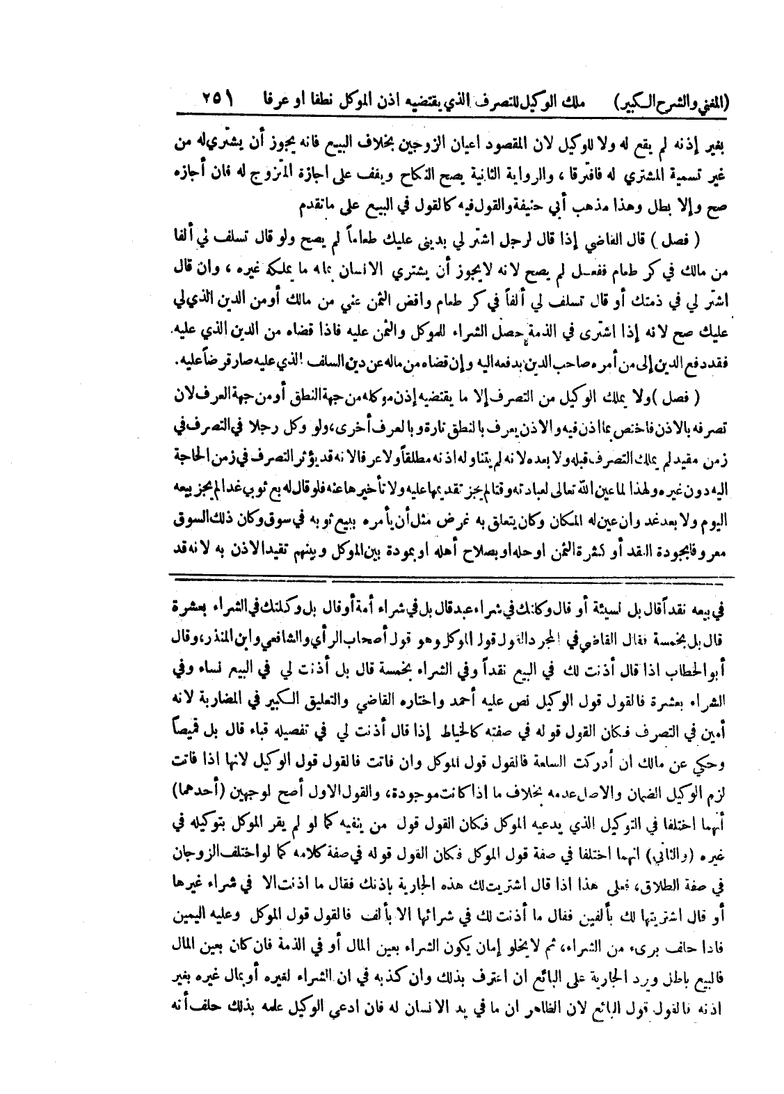 في بيعه نقداقال بل نسيئة أو قال وكلتك في شراء عبد قال بل في شراء أمة أو قال بل وكلتك في الشراء بعشرة قال بل بخمسة فقال القاضي في المجرد القول قول الموكل وهو قول أصحاب الرأي والشافعي وابن المنذر، وقال أبو الحطاب إذا قال أذنت لك في البيع نقدا وفي الشراء بخمسة قال بل أذنت لي في البيع نساء وفي الشراء بعشرة فالقول قول الوكيل نص عليه أحمد واختاره القاضي والتعليق الكبير في المضاربة لأنه أمين في التصرف فكان القول قوله في صفته كالخياط إذا قال أذنت لي في تفصيله قباء قال بل قميصاً وحكي عن مالك إن أدركت السلعة فالقول قول الموكل وإن فاتت فالقول قول الوكيل لأنها إذا فاتت لزم الوكيل الضمان والأصل عدمه بخلاف ما إذا كانت موجودة، والقول الأول أصح لوجهين (أحدهما) أنهما اختلفا في التوكيل الذي يدعيه الموكل فكان القول قول من ينفيه كما لو لم يقر الموكل بتوكيله في غيره (والثاني) أنهما اختلفا في صفة قول الموكل فكان القول قوله في صفة كلامه كما لو اختلف الزوجان