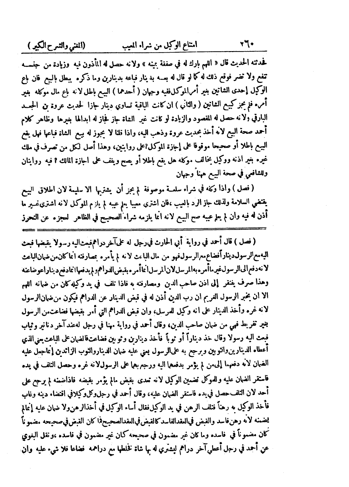 (فصل) قال أحمد في رواية أبي الحارث في رجل له على آخر دراهم فبعث إليه رسولاً يقبضها فبعث إليه مع الرسول ديناراً فضاع مع الرسول فهو من مال الباعث لأنه لم يأمره بمصارفته إنما كان من ضمان الباعث لأنه دفع إلى الرسول غير ما أمره به المرسل لأن المرسل إنما أمره بقبض الدراهم ولم يدفعها إنما دفع ديناراً عوضاً عنه وهذا صرف يفتقر إلى إذن صاحب الدين ومصارفته به فإذا تلف في يد وكيله كان من ضمانه اللهم إلا أن يخبر الرسول الغريم أن رب الدين أذن له في قبض الدينار عن الدراهم فيكون من ضمان الرسول لأنه غره وأخذ الدينار على أنه وكيل للمرسل، وإن قبض الدراهم التي أمر بقبضها فضاعت من الرسول بغير تفريط فهي من ضمان صاحب الدين، وقال أحمد في رواية منها في رجل له عند آخر دنانير وثياب فبعث إليه رسولاً وقال خذ ديناراً أو ثوباً فأخذ دينارين وثوبين فضاعت فالضمان على الباعث يعني الذي أعطاه الدينار ين والثور بين ويرجع به على الرسول يعني عليه ضمان الدينار والثوب الزائداين إنما جعل عليه