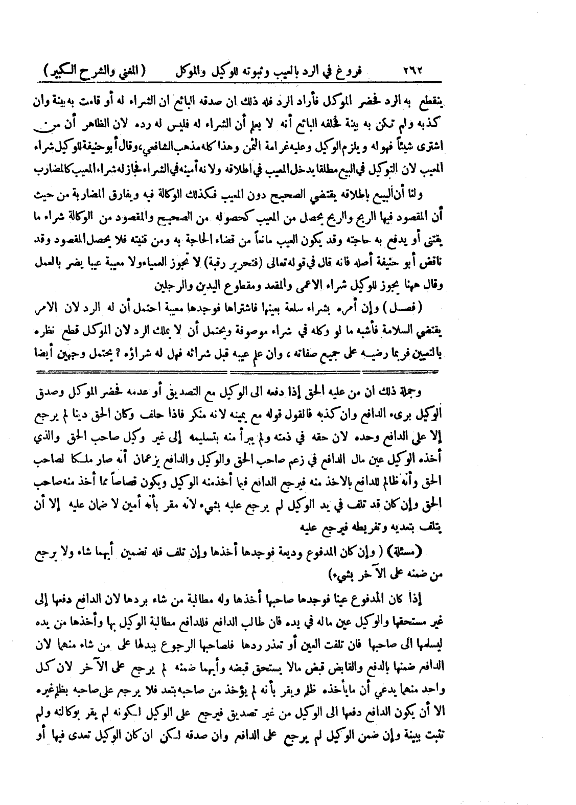 وجملة ذلك أن من عليه الحق إذا دفعه إلى الوكيل مع التصديق أو عدمه فحضر الموكل وصدق الوكيل برئ الدافع وإن كذبه فالقول قوله مع يمينه لأنه منكر فإذا حلف وكان الحق ديناً لم يرجع إلا على الدافع وحده لأن حقه في ذمته ولم يبرأ منه بتسليمه إلى غيرو كيل صاحب الحق والذي أخذه الوكيل عين مال الدافع في زعم صاحب الحق والوكيل والدافع يزعمان أنه صار ملكاً لصاحب الحق وأنه ظالم للدافع بالأخذ منه فيرجع الدافع فيما أخذ منه الوكيل ويكون قصاصاً مما أخذ منه صاحب الحق وإن كان قد تلف في يد الوكيل لم يرجع عليه بشئ لأنه مقر بأنه أمين لا ضمان عليه إلا أن يتلف بتعديه وتفريطه فيرجع عليه (مسألة) (وإن كان المدفوع وديعة فوجدها أخذها وإن تلف فله تضمين أيهما شاء ولا يرجع من ضمنه على الآخر بشئ) إذا كان المدفوع عيناً فوجدها صاحبها أخذها وله مطالبة من شاء بردها لأن الدافع دفعها إلى غير مستحقها والوكيل عين ماله في يده فإن طالب الدافع فللدافع مطالبة الوكيل بها وأخذها من يده ليسلمها إلى صاحبها فإن تلفت العين أو تعذر ردها فلصاحبها الرجوع ببدلها على من شاء منهما لأن الدافع ضمنها بالدفع والقابض قبض مالا يستحق قبضه وأيهما ضمنه لم يرجع على الآخر لأن كل واحد منهما يدعي أن ما يأخذ ظلم ويقر بأنه لم يؤخذ من صاحبه بتعد فلا يرجع على صاحبه بظلم غيره إلا أن يكون الدافع دفعها إلى الوكيل من غير تصديق فيرجع على الوكيل لكونه لم يقر بوكالته ولم يثبت ببينة وإن ضمن الوكيل لم يرجع على الدافع وإن صدقه لكن إن كان الوكيل تعدى فيها أو